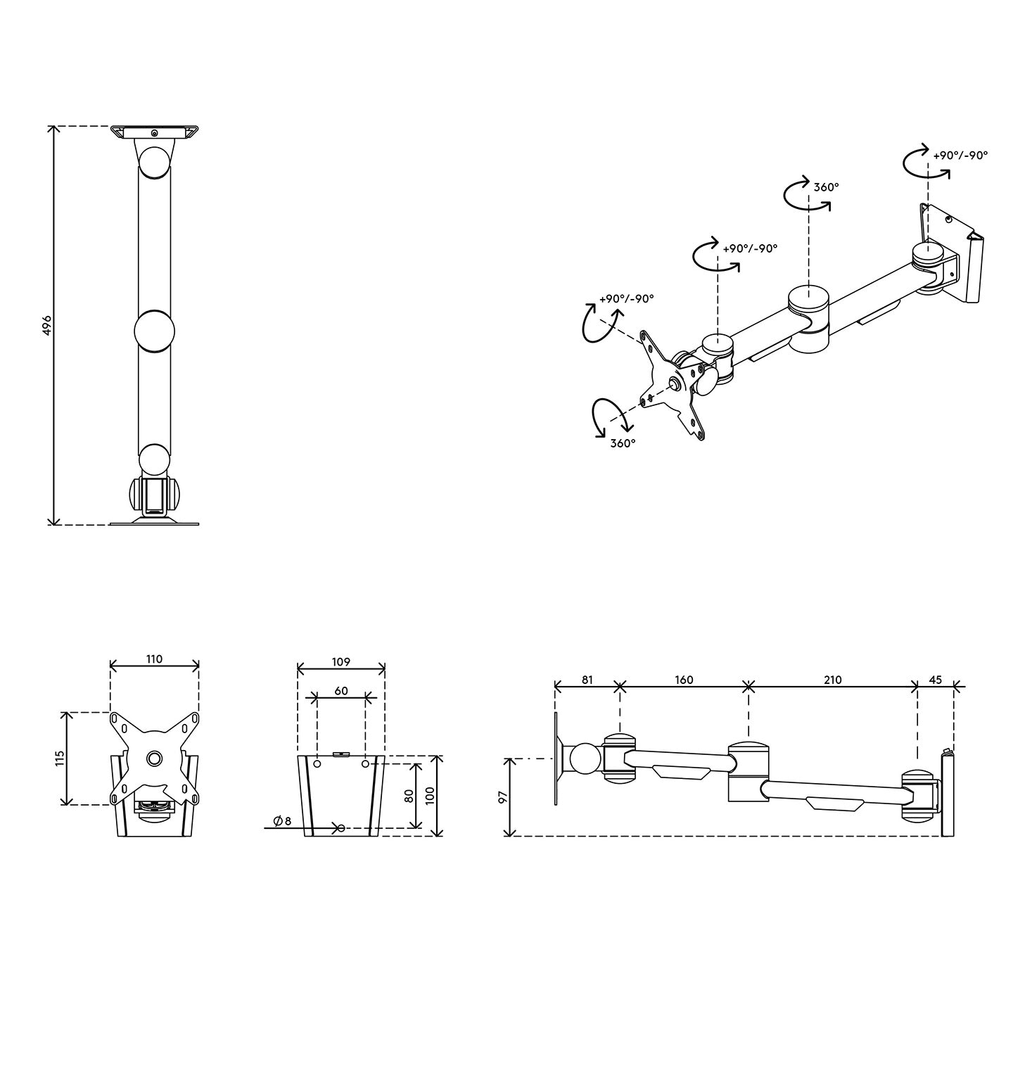Monitor: tilt +90°/-90°, swivel +90°/-90°, rotate 360°