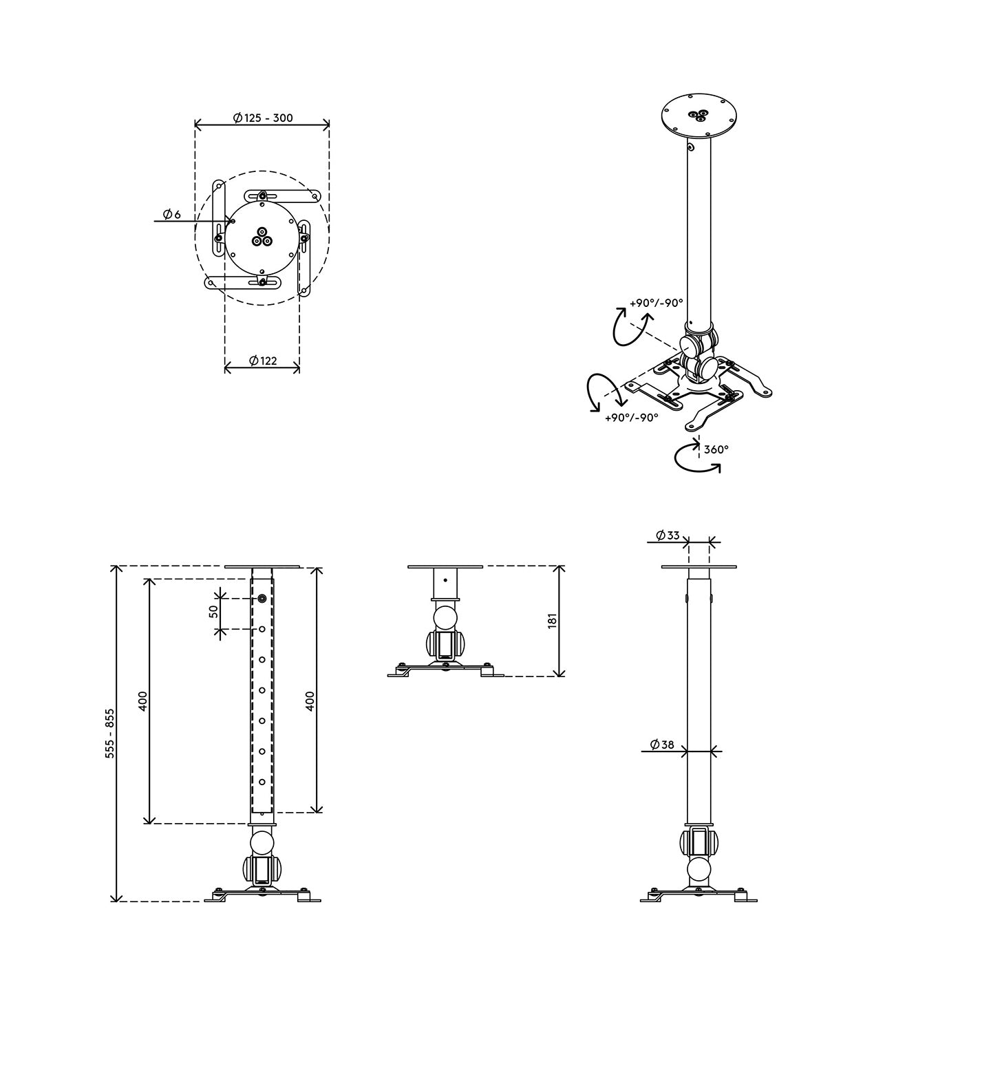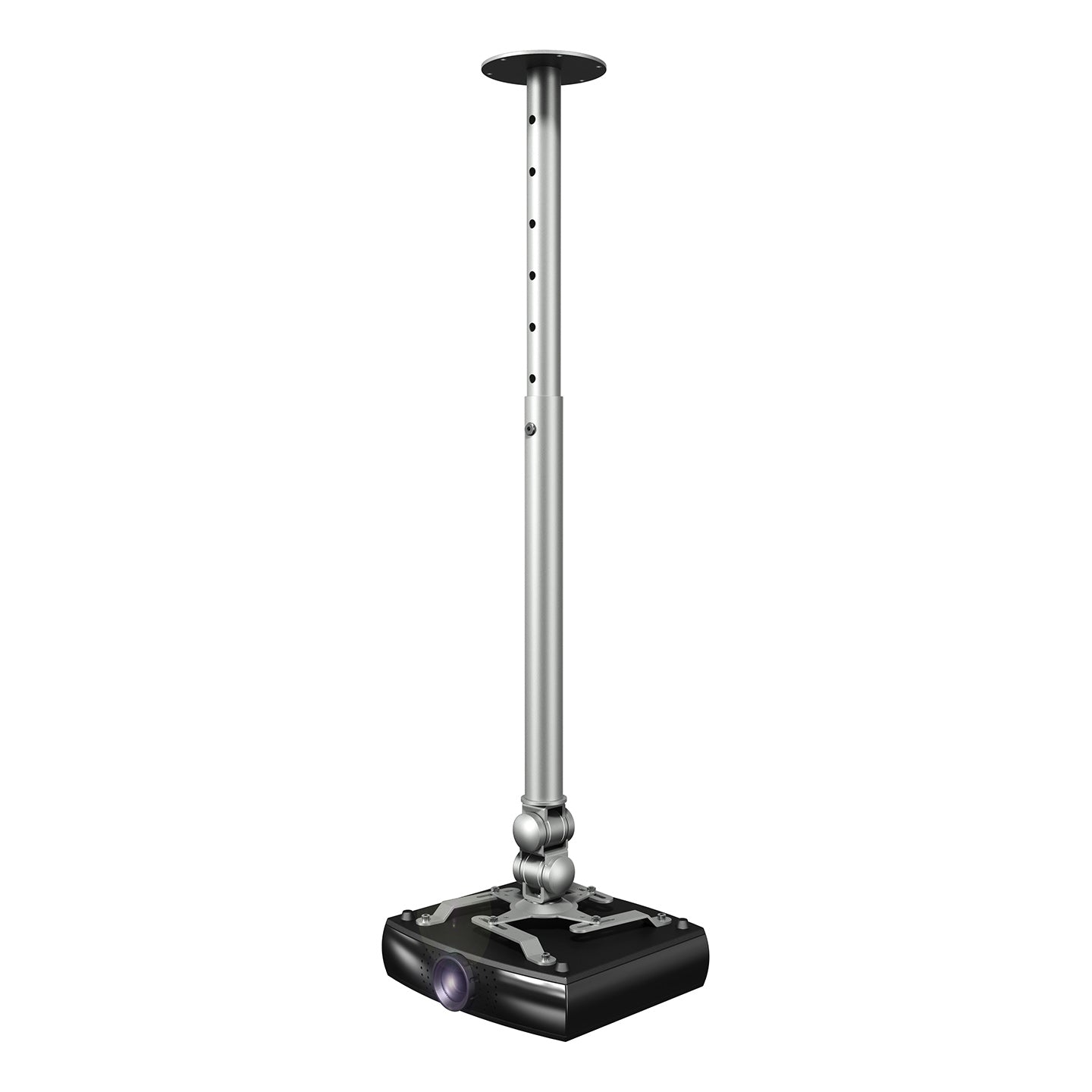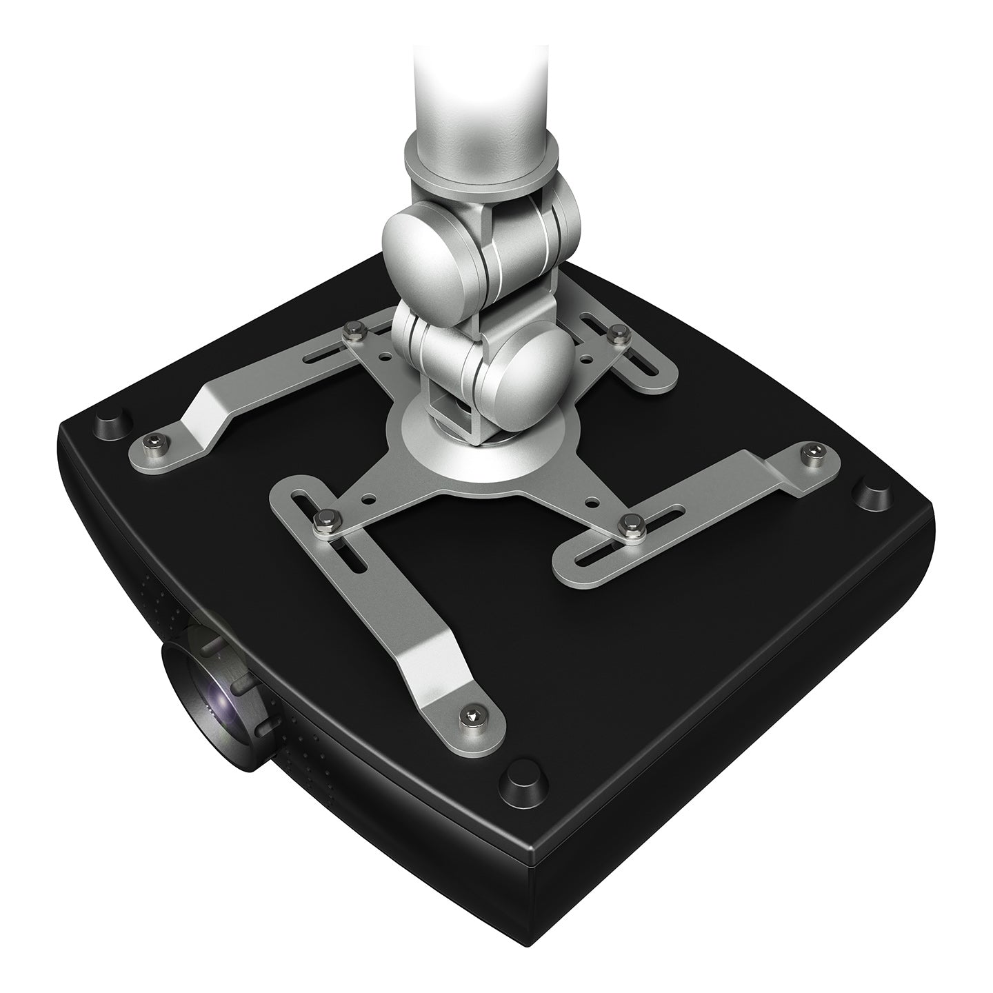 Having freely adjustable mounting brackets, this beamer mount attaches nearly all beamers or projectors to a ceiling. It can be assembled as a height adjustable or fixed height variation, enabling it to be mounted almost anywhere. Multiple joints and pivots on both variations allow for precise adjustments.