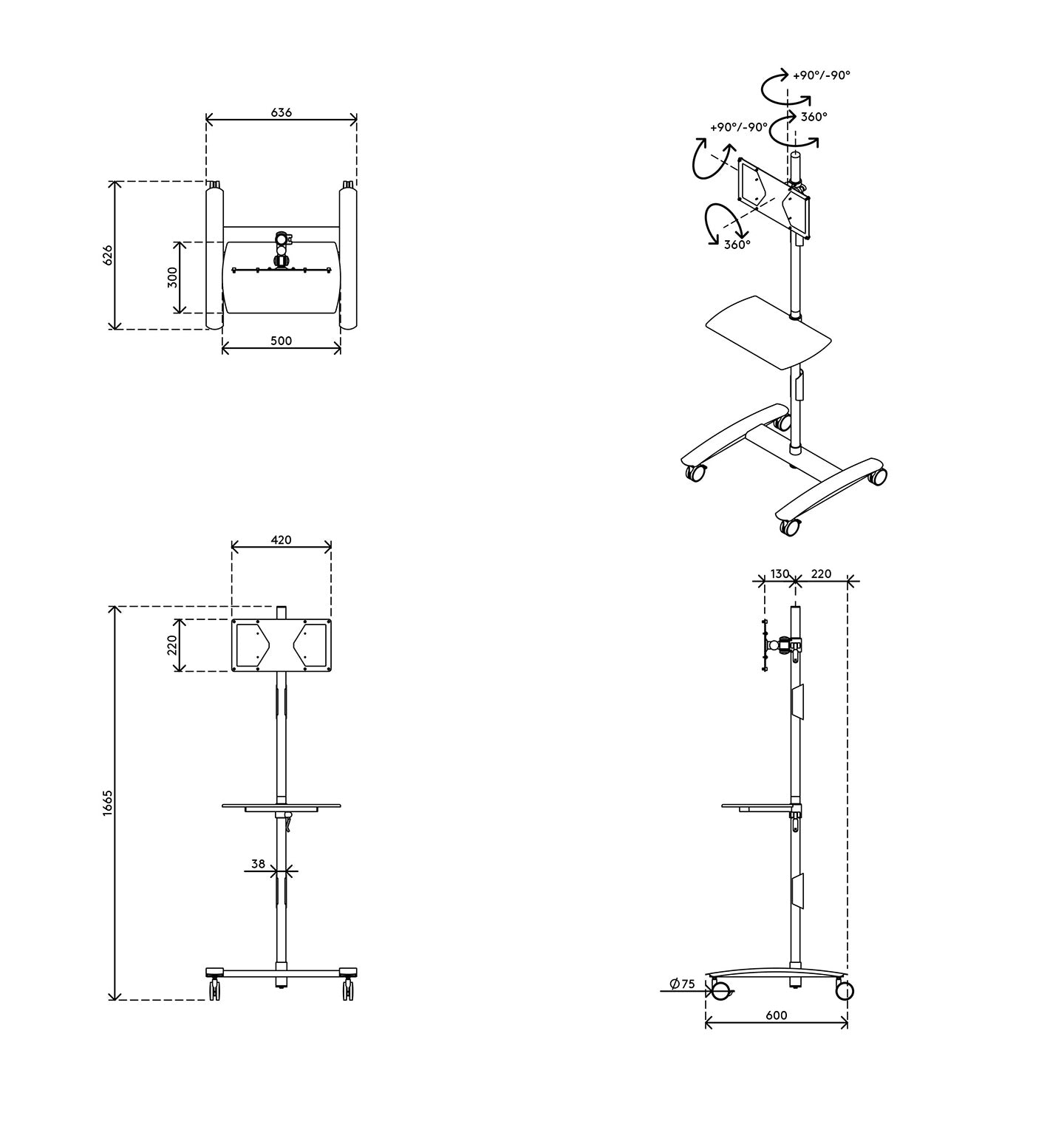 Trolley dimensions (wxdxh): 636 x 600 x 1665 mm (25.0 x 23.6 x 65.6")