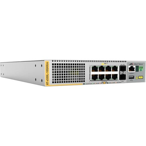 Allied Telesis x530L x530L-10GHXm 8 Portas Gerenciável Comutador de camada 3 - Ethernet de 10 Gigabit - 10GBase-X - 3 Camada suportada - Modular - 60 W Power Consumption - 500 W Orçamento de PoE - Cabo de par entrançado, Fibra ótica - PoE Ports - Montável sobre rack, Montagem em parede. x530L Series Stackable Intelligent Layer 3 Switches. The Allied Telesis x530L Series stackable Layer 3 switches feature high capacity, resiliency and easy management. With both MultiGigabit and high port density models, they are the ideal choice for network access applications. Overview: The Allied Telesis x530L Series are a high-performing and featurerich choice for today's networks. The x530L-10GHXm features 8 x 100M/1/2.5/5G Multi-Gigabit ports with 2 x 10 Gigabit uplinks, while 28 and 52 port models feature 24 or 48 x 10M/100M/1 Gigabit ports with 4 x 10 Gigabit uplinks. The ability to stack multiple units, enables a versatile solution for enterprise applications. The x530L-10GHXm supports PoE++ (up to 90W per port), while 28 or 52 port GPX models support PoE+ (up to 30W per port), making them perfect for connecting and powering devices at the network edge such as wireless access points, and IP surveillance cameras. Network Management: Vista Manager™ EX bundled with Allied Telesis Autonomous Management Framework™ (AMF) meets the increasing management requirements of modern networks. While AMF allows an entire network to be securely and easily managed as a single virtual device, Vista Manager EX provides an intuitive and powerful graphical tool for monitoring and managing AMF wired, Autonomous Wave Control (AWC) wireless, and third party (SNMP) devices. Cybersecurity: The x530L Series acting as an AMF member is compatible with our AMFSecurity solution, which enables a self-defending network. The AMF-Sec controller responds immediately to any internal malware threats by instructing the x530L to isolate the affected part of the network, and quarantine the suspect device. Vista Manager EX alerts networks administrators of threats that have been dealt with. Resilient: Today's converging online services mean there is increasing demand for highly-available networks with minimal downtime. Allied Telesis Virtual Chassis Stacking (VCStack™), in conjunction with link aggregation, provides a network with no single point of failure and application resiliency. x530L Series switches can form a VCStack of up to eight units for enhanced resiliency and simplified management. Mixed stacking allows the x530L Series to stack with x530 Series Switches. Stacking over Long Distance (VCStack™ LD), which enables stacks to be created over long distance fiber links, makes the x530L Series the perfect choice for distributed environments too. Allied Telesis Ethernet Protection Switched Ring (EPSRing™), and the standards-based G.8032 Ethernet Ring Protection, ensure that distributed network segments have high-speed, resilient access to online resources and applications. Reliable: The x530L Series was designed with reliability in mind, and guarantees continual delivery of essential services. The 28 and 52 port models feature dual built-in power supplies, and all models have near-hitless online stack reconfiguration, so maintenance does not affect network uptime.