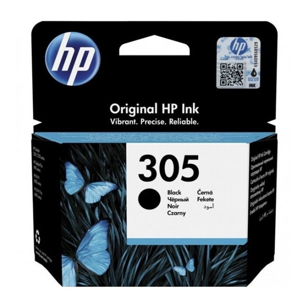 HP Original 305 Black Ink Cartridge. Ink type: Pigment-based ink, Cartridge type: Standard yield, Black ink volume: 2 ml, Package type: Individual pack, Pack quantity: 1 pc(s), Black page capacity: 120 pages
