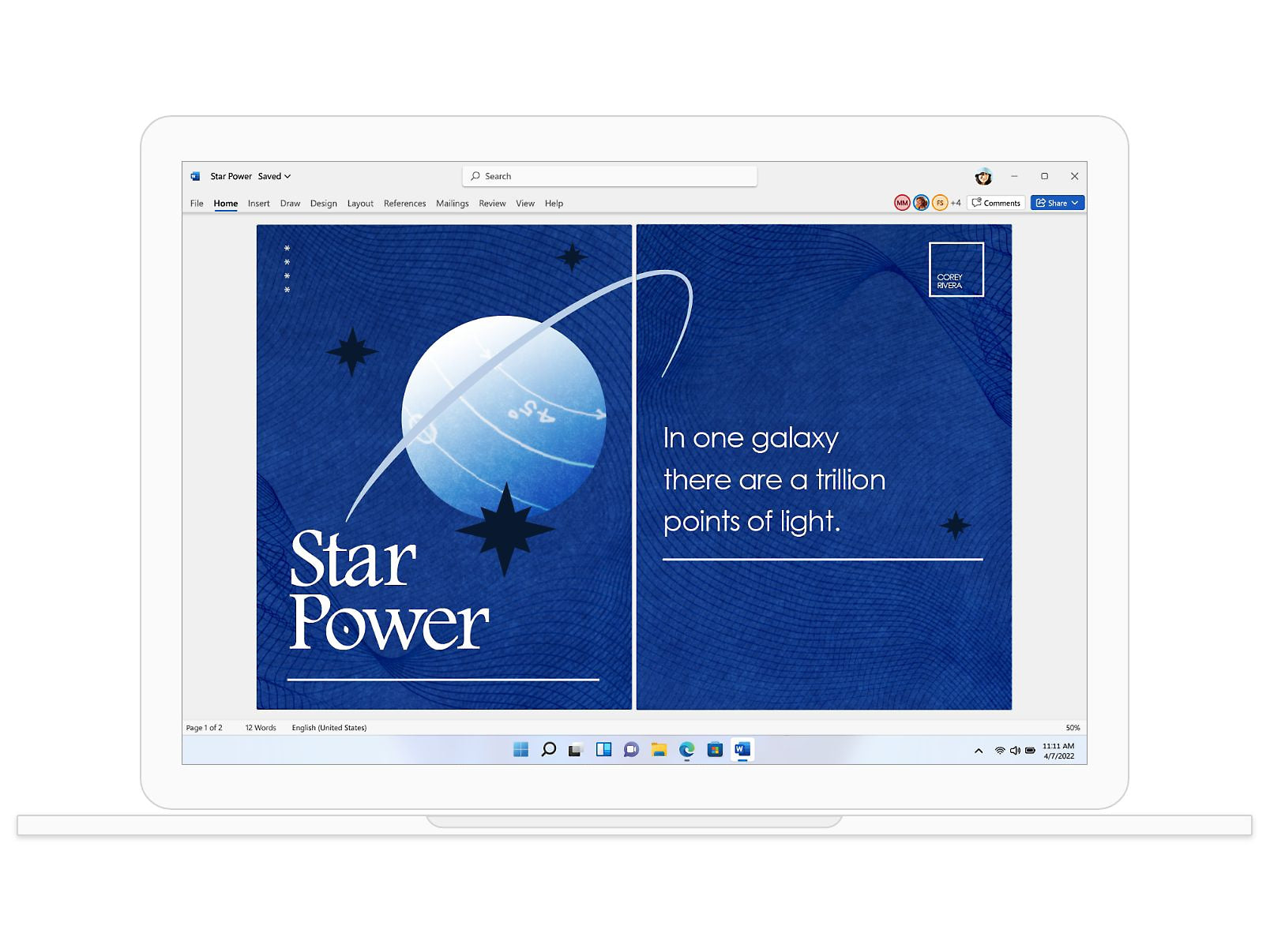 Annual price, per user. Annual Subscription – Automatically renews. Microsoft 365 lets you collaborate in real time with professional email, online storage, advanced security, and always-up-to-date teamwork tools. Includes: Web and mobile versions of the Office apps only; Chat, make calls and meet with up to 300 participants; 1 TB of cloud storage per user; Enterprise-grade email; Standard security; Phone and web support 24/7. Web and mobile applications and services: MicrosoftWord; MicrosoftExcel; MicrosoftPowerPoint; MicrosoftTeams; MicrosoftOutlook; MicrosoftExchange; MicrosoftOneDrive; MicrosoftSharePoint. Product highlights: Get started quickly with documents, spreadsheets, presentations, and email; Use Microsoft Teams to hold online meetings and chat securely; Help keep company data safe on your devices; Get phishing and malware protection to protect against cyber threats; Manage new PCs and devices quickly and easily; Back up and share files with a terabyte of cloud storage.