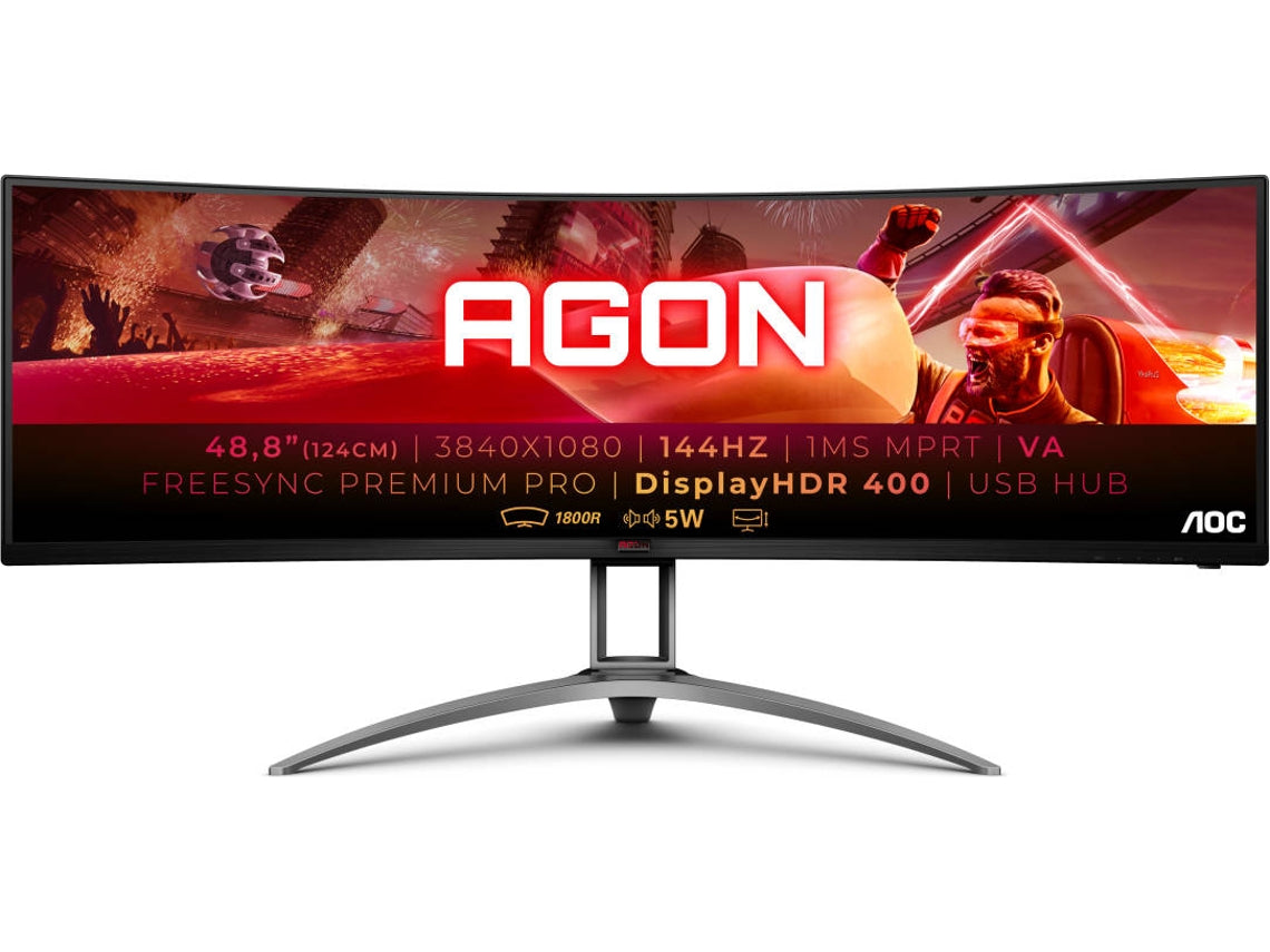 AOC AG493QCX. Screen size diagonal: 124 cm (48.8), Resolution: 3840 x 1080 pixels, Display technology: LED, Response time: 4 ms, Native aspect ratio: 32:9, viewing angle (horizontal): 178° , viewing angle (vertical): 178°. Built-in speakers. Integrated USB hub, USB hub version: 3.2 Gen 1 (3.1 Gen 1). VESA Mount, Height Adjustment. Product Color: Black, Red