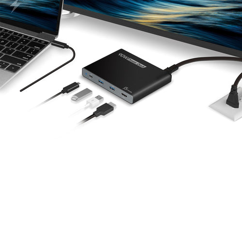 j5create JCDP392-EN. Interface do host: USB 3.2 Gen 1 (3.1 Gen 1) Type-C, Interfaces de hub: HDMI, USB 3.2 Gen 1 (3.1 Gen 1) Type-A, USB 3.2 Gen 1 (3.1 Gen 1) Type-C. Velocidade real de transferência: 5000 Mbit/s, Resolução de gráficos suportados: 1920 x 1080 (HD 1080), 3840 x 2160, Resolução máxima (HDMI): 3840 x 2160 pixels. Voltagem da entrada: 100 - 240 V, Corrente de entrada: 1.5 A, Frequência de entrada AC: 50/60 Hz. Largura: 129 mm, Profundidade: 19,5 mm, Altura: 105 mm. Quantidade por conjunto: 1 unidade(s), Comprimento da embalagem: 193 mm, Profundidade da embalagem: 125 mm. "The 90W built-in USB-C™ Travel Dock combines the capability of four single-function adapters into a portable docking station for your laptop. You can connect a 4K HDMI™ display, two USB™ 3.0 peripherals and charge your device with up to 65W of power delivery and 2.4A fast charging. Working with Windows®, macOS® and Android™, the JCDP392 features a compact design that includes a detachable power cord and a USB-C™ cable, meaning you have less cables to carry when you are on the move!"