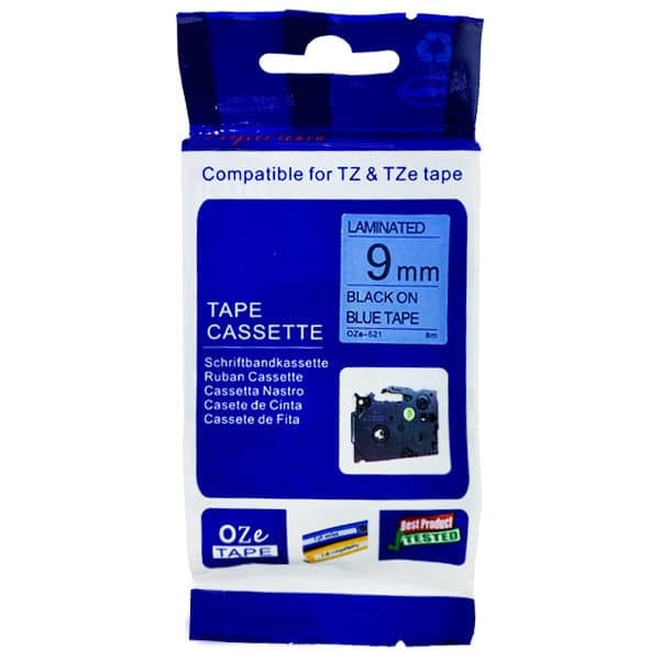 Brother TZe-521. Label Color: Black on Blue, Ribbon Type: TZe, Print Technology: Thermal Transfer. Ribbon width: 9 mm, Ribbon length: 8 m, Pack quantity: 1 pc(s)