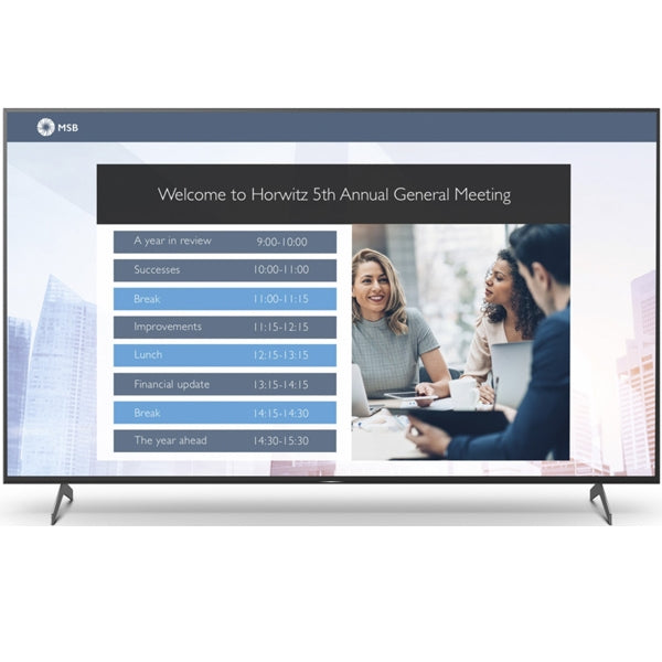 Sony FW-55BZ40H. Screen size diagonally: 139.7 cm (55), Display technology: LCD, Resolution: 4096 x 2160 pixels. RMS Power Rating: 20 W. Product Design: Digital Plasma, Product Color: Black, Installation Supported: Indoor. Purpose: Education, Hours/Days: 24/7. Power consumption (typical): 173 W, Power consumption (standby): 0.5 W, Energy efficiency class (SDR): G