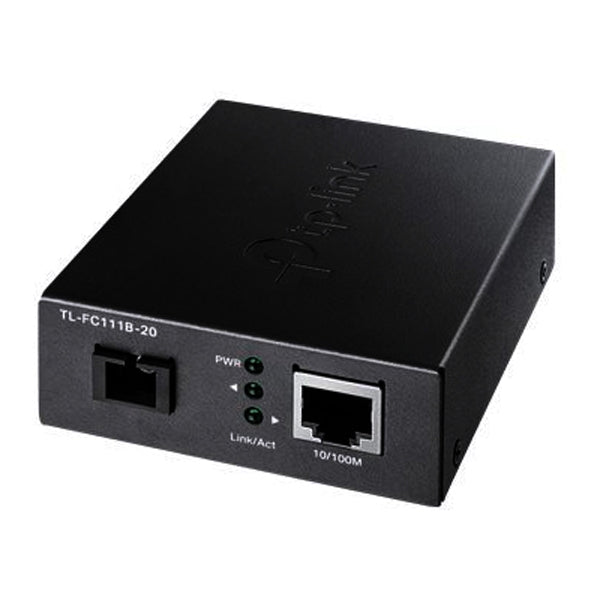 TP-LINK TL-FC111B-20. Maximum data transfer rate: 100 Mbit/s, Communications standards: IEEE 802.3,IEEE 802.3i,IEEE 802.3x, Copper ethernet cabling technology: 10BASE-T,100BASE-T. Fiber optic connector: SC, Connectivity technology: Wired. Maximum transfer distance: 20000 m, Fiber structure mode: Single mode, Supported fiber cable diameter: 9/125 µm. LED Indicators: Activity, On, Powder, Product Color: Black, Certification: FCC, CE. Output voltage: 5V, Output current: 0.6A