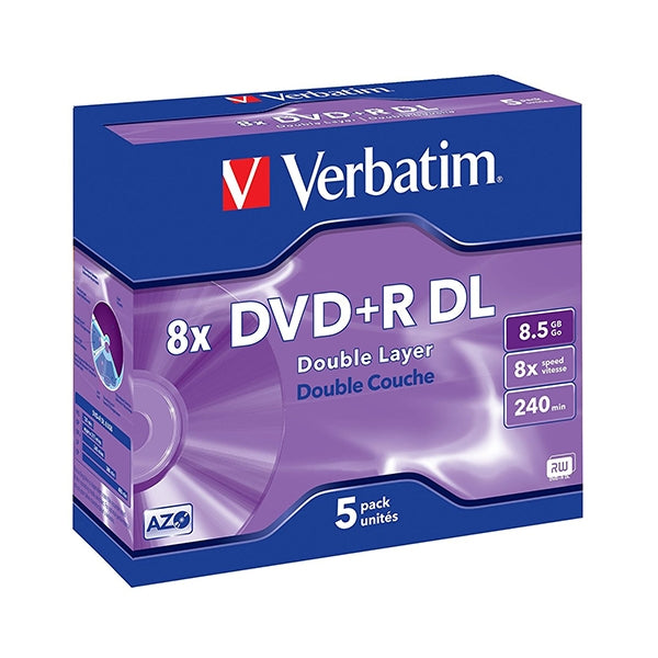 VERBATIM DVD+R 8X 8.5GB 240MIN DOUBLE LAYER CAIXA NORMAL (JEWEL) PACK 5