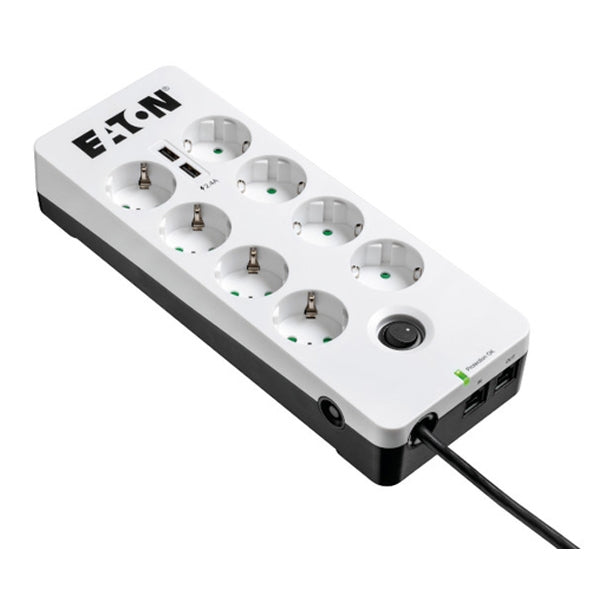 Eaton PB8TUD. Number of AC outputs: 8 AC outlet(s), Rated input voltage: 220-250 V, AC input frequency: 50 - 60 Hz. Case Color: Black, White. Product weight: 705 g, Length: 315 mm, Width: 55 mm. Regulatory Approvals: CE / EAC / CM
