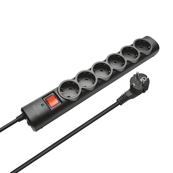 Extension cord with 6 surge-protected sockets to connect and power devices safely, includes a 1.8 m long cable, Convenient main switch to switch off all equipment at the same time, Sockets with child safety protection to prevent access to socket contacts, Protects sensitive equipment from damage from surges and surges, Sockets angled at 45 degrees for easy access, Illuminated switch that indicates On or Off mode, Fixing holes for easy wall mounting