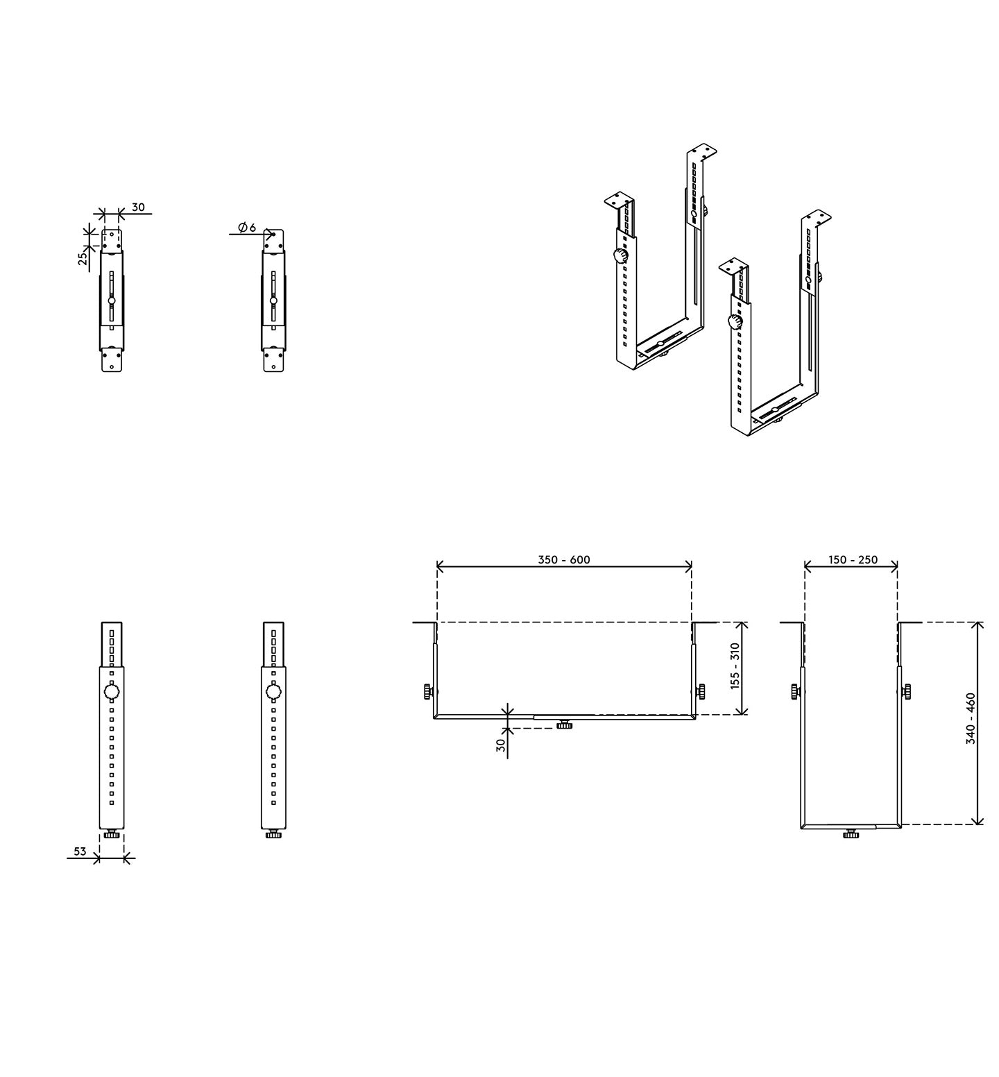 Max. CPU dimensions horizontally between 350 - 600 mm (13.8" - 23.6") wide and 155 - 310 mm (6.1" - 12.2") high