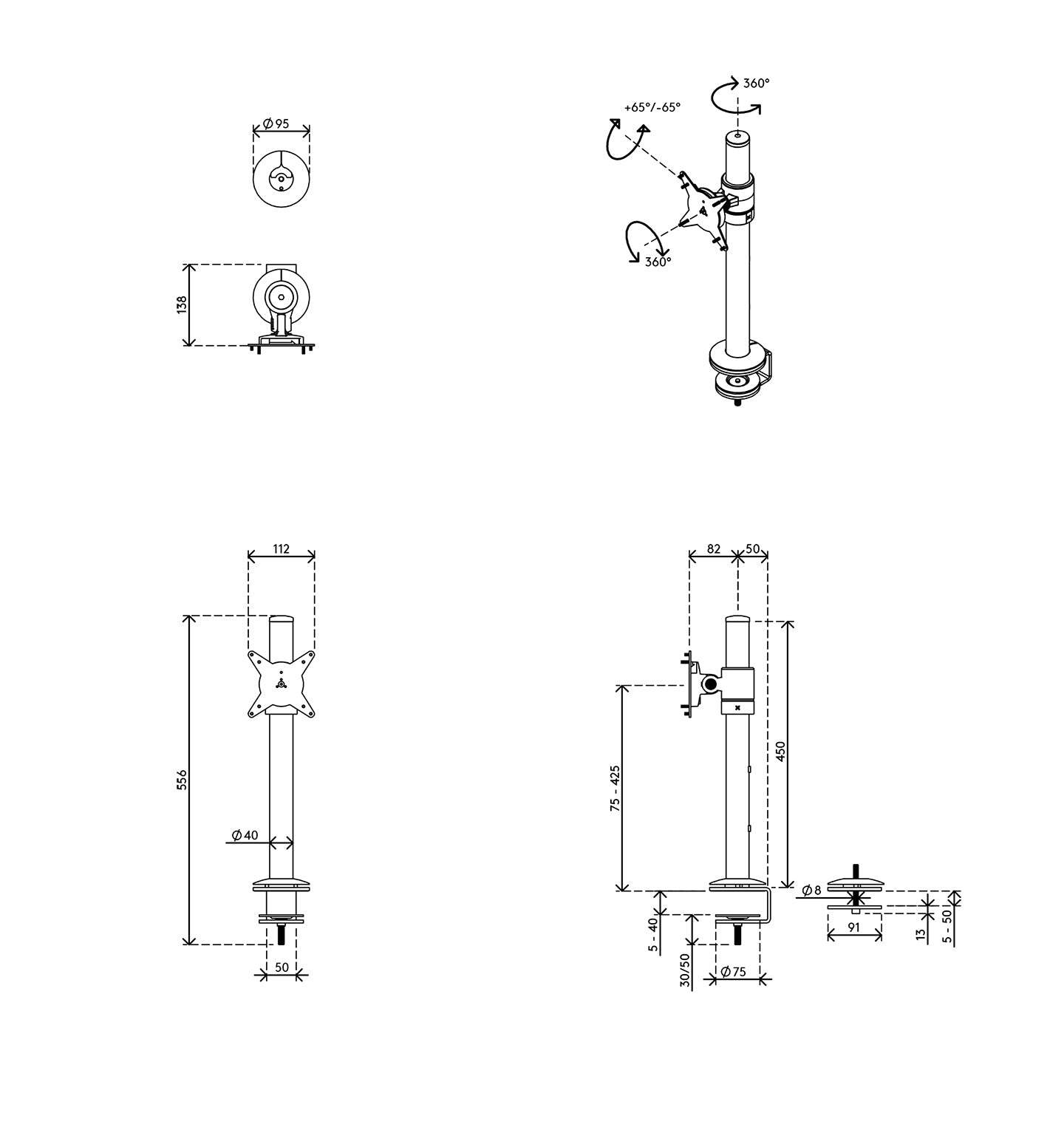 Suitable for a desktop thickness of 5 up to 40 mm (0.2" - 1.6") (clamp) or 50 mm (2.0") (bolt through)