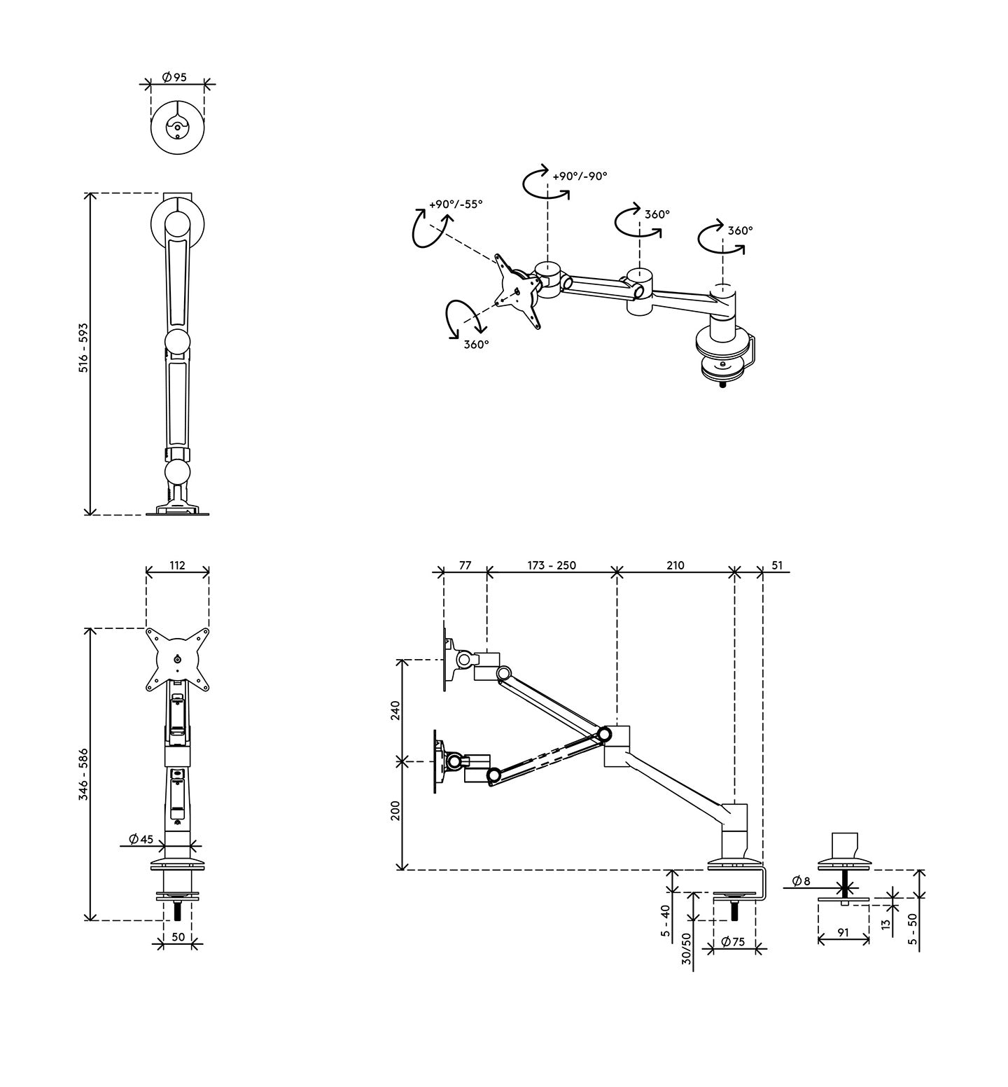 Monitor: tilt +90°/-55°, swivel +90°/-90°, rotate 360°