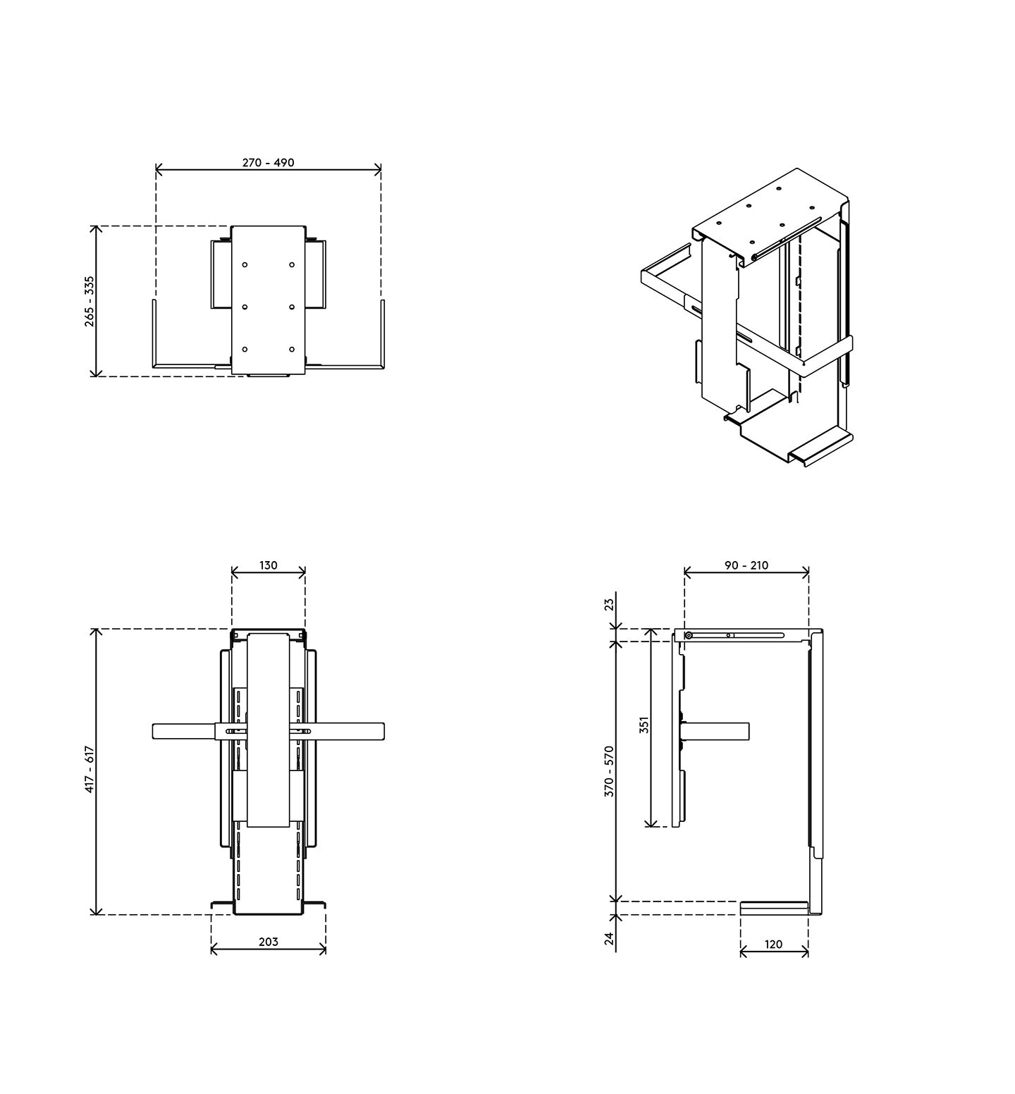 Holds any CPU/PC between 90 - 210 mm (3.5" - 8.3") wide, 370 - 570 mm (14.6" - 22.4") high and 270 - 490 mm (10.6" - 19.3") in depth