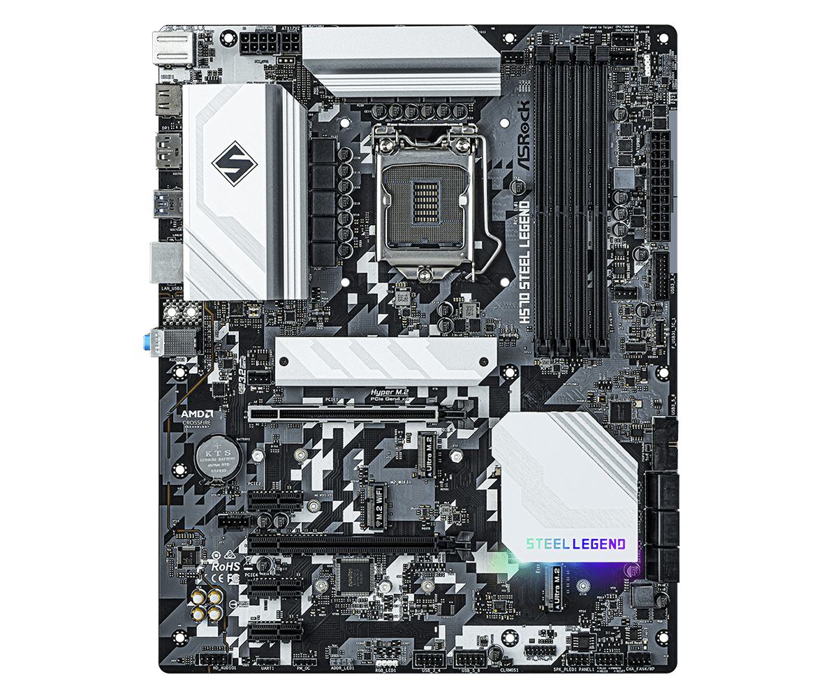 Asrock H570 Steel Legend. Fabricant de processeur: Intel, Socket de processeur (réceptable de processeur): LGA 1200 (Socket H5), Processeurs compatibles: Intel® Celeron®, Intel® Core™ i3, Intel Core i5, Intel Core i7, Intel Core i7 Extreme.... Types de mémoire pris en charge: DDR4-SDRAM, Mémoire interne maximale: 128 Go, Type de support (slot): DIMM. Interfaces de lecteur de stockage prises en charge: M.2,SATA III,Ultra M.2, Types de lecteurs de stockage pris en charge: HDD & SSD. Technologie de Traitement en parallèle: CrossFireX,Quad-GPU CrossFireX, Résolution maximale: 4096 x 2304 pixels. Connecteur USB: USB Type-A, USB Type-C