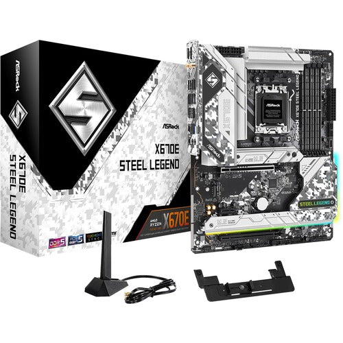 Asrock X670E Steel Legend. Fabricante do processador: AMD, Socket do processador: Ranhura AM5, Processador: AMD Ryzen 7 7th Gen. Tipos de memórias compatíveis: DDR5-SDRAM, Memória interna máxima: 128 GB, Tipo de ranhuras de memória: DIMM. Interfaces de armazenamento suportadas: M.2, SATA III, Tipos de unidade de armazenamento suportados: HDD & SSD, Níveis RAID: 0, 1, 10. Apoio a tecnologia paralela de processamento: Crossfire. Tipo de interface ethernet: 2.5 Gigabit Ethernet, Gigabit Ethernet, Controlador LAN: Dragon RTL8125BG, Realtek RTL8111, Padrão Wi-Fi máximo: Wi-Fi 6E (802.11ax)