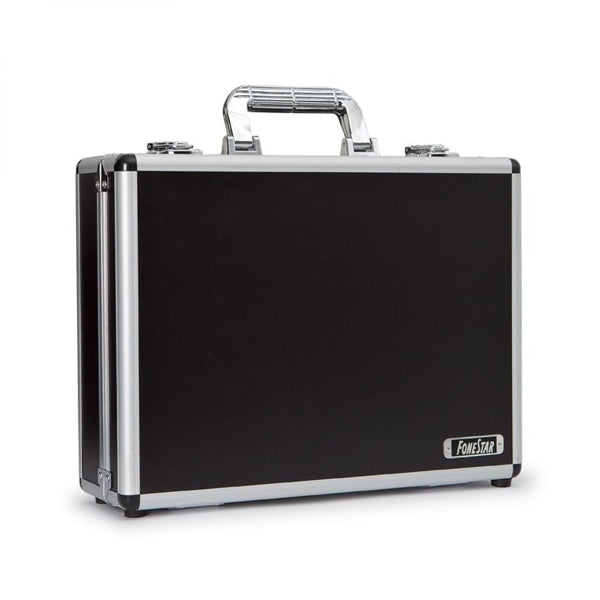Maletín de transporte para sistemas de microfonía inalámbrica FONESTAR mods. MSH-883, MSH-887, MSH-823 y MSH-828 (no incluidos). En madera contrachapada revestida. Tapa herméticamente sellada, asa de transporte y cantoneras metálicas protectoras. Estructura interna de espuma que brinda máxima fijación y protección al micrófono inalámbrico profesional FONESTAR Sistema de construcción robusta. Acabado en esmalte negro.