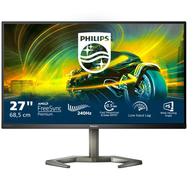 Momentum de Philips 27M1N5200PA/00. Diagonal del tamaño de la pantalla: 68,6 cm (27), Resolución: 1920 x 1080 Pixeles, Tipo HD: Full HD, Tecnología de visualización: LED, Superficie de la pantalla: Mate, Tiempo de respuesta: 1ms, Relación de aspecto nativa: 16:9, ángulo de visión (horizontal ): 178°, ángulo de visión (vertical): 178°. Altavoces incorporados. Concentrador USB integrado. Montaje VESA, Ajuste de altura. Color del producto: Negro Longitud de ensamblaje (con soporte) 614 mm Ancho de ensamblaje (con soporte) 212 mm Altura de ensamblaje (con soporte) 549 mm Peso (con soporte) 4,92 kg