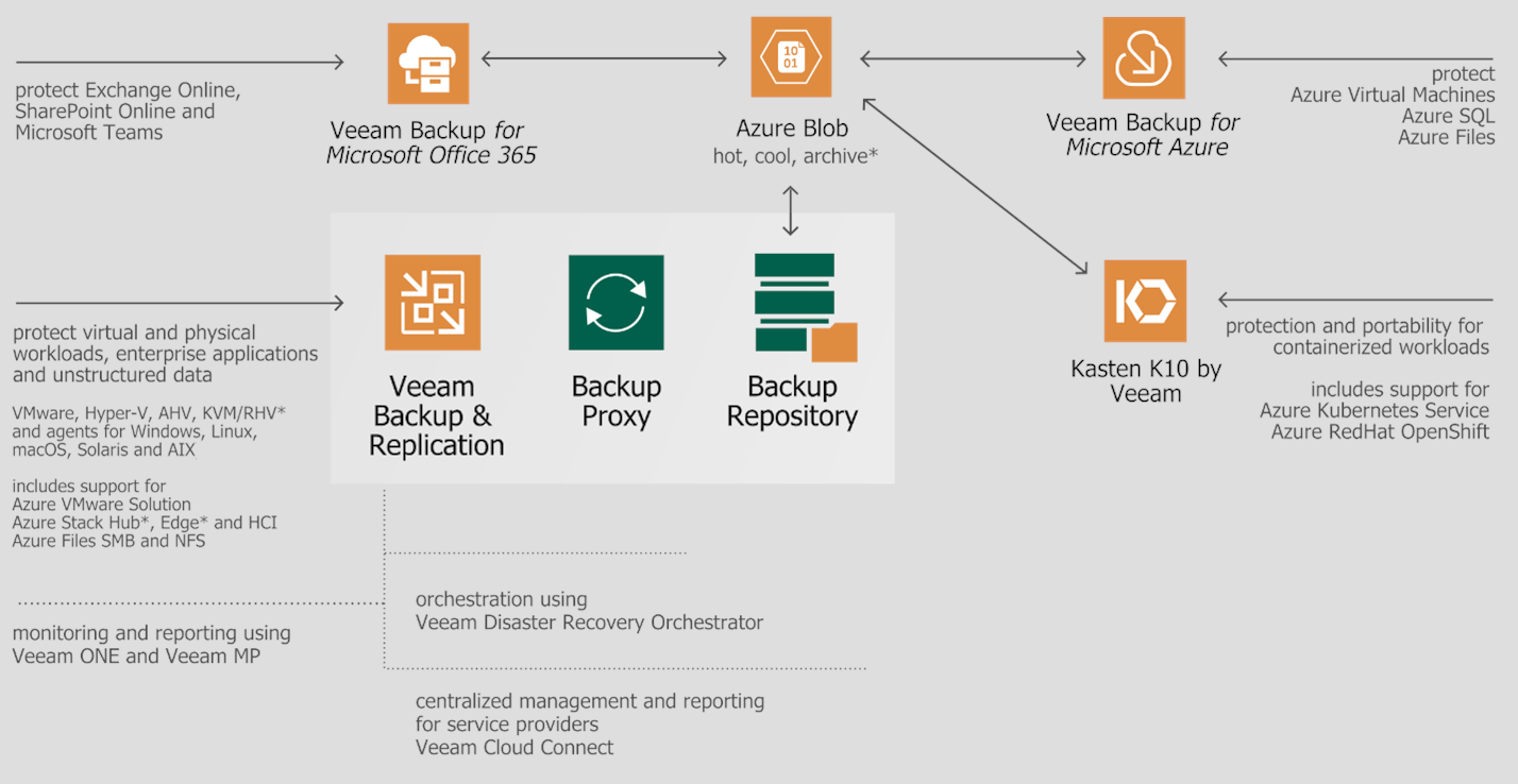 RESPALDO DE VEEAM PARA MICROSOFT AZURE. Copia de seguridad y recuperación a Azure. Simple. Económico. Seguro. Listo para la nube híbrida: protección de datos nativa para todos sus datos de Azure, RTO casi nulo desde instancias completas hasta archivos individuales, copia de seguridad de bajo costo para cumplir con los objetivos de retención y cumplimiento. Copia de seguridad y recuperación nativas en Azure. El mejor servicio de copias de seguridad para Azure. Microsoft Azure proporciona una plataforma informática en la nube para crear, probar e implementar aplicaciones modernas con agilidad y escalabilidad. Si bien Microsoft es responsable de la infraestructura, el modelo de responsabilidad compartida deja en claro que usted es responsable de proteger sus datos. Configúrelo y olvídese: copia de seguridad nativa basada en políticas y automatización de instantáneas. Respaldo de bajo costo: controle los costos de la nube y cumpla con los objetivos de retención y cumplimiento. Una plataforma: gestione de forma centralizada entornos físicos, virtuales, en la nube, SaaS y Kubernetes. Recuperación rápida y flexible: RTO casi nulos de instancias completas a archivos individuales. Seguridad y cumplimiento mejorados: adopte las prácticas recomendadas de seguridad de Azure para protegerse contra el ransomware. Movilidad en la nube: Copia de seguridad, recuperación y migración a cualquier entorno, ofreciendo una movilidad completa. Características: nativo de Azure, totalmente automatizado, niveles de bajo costo, copia de seguridad en SQL en Azure, copia de seguridad en archivos de Azure, recuperación rápida, movilidad de datos y aplicaciones, suscripción cruzada y copia de seguridad regional, control de acceso basado en roles, costos de cálculo de costos, firma múltiple compatible, preparado para la nube híbrida. ¡Aprenda cómo Veeam realiza copias de seguridad en Azure! Instantáneas y copias de seguridad: automatización basada en políticas de instantáneas y copias de seguridad; Instantáneas de nivel en el almacenamiento de blobs de Azure (caliente o frío). Recuperación en Azure: recuperación completa de máquinas virtuales (VM) o volúmenes de Azure en la misma ubicación o en otra diferente a partir de instantáneas y copias de seguridad de almacenamiento de objetos; Recuperación a nivel de archivo a partir de copias de seguridad de almacenamiento de instantáneas y objetos. Recuperar fuera de Azure: copiar el trabajo de copia de seguridad en el almacén de copias de seguridad local; Instant VM Recovery®; Recuperación para máquinas virtuales locales (solo máquinas virtuales); Restauración directa a AWS y Google Cloud.