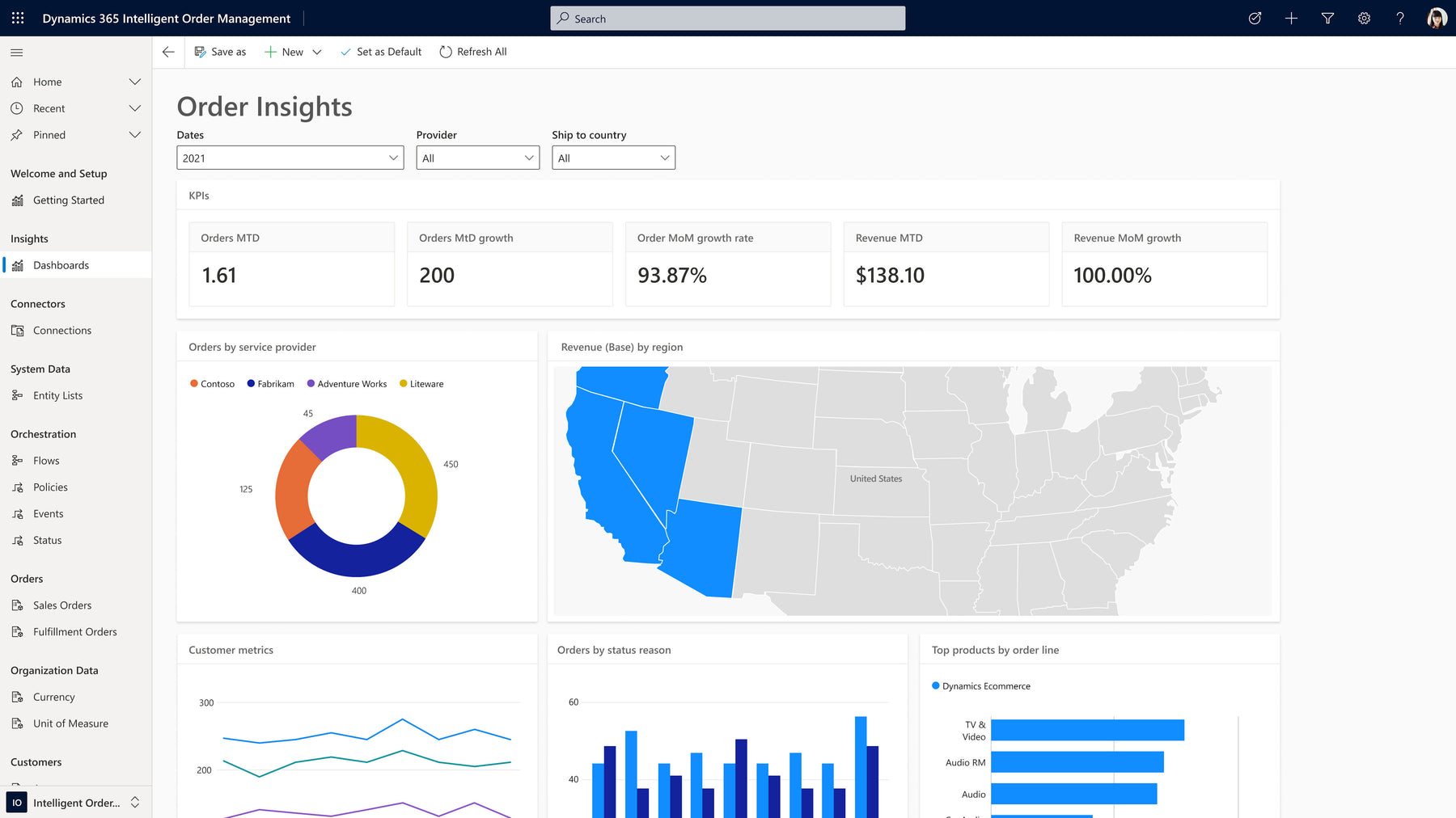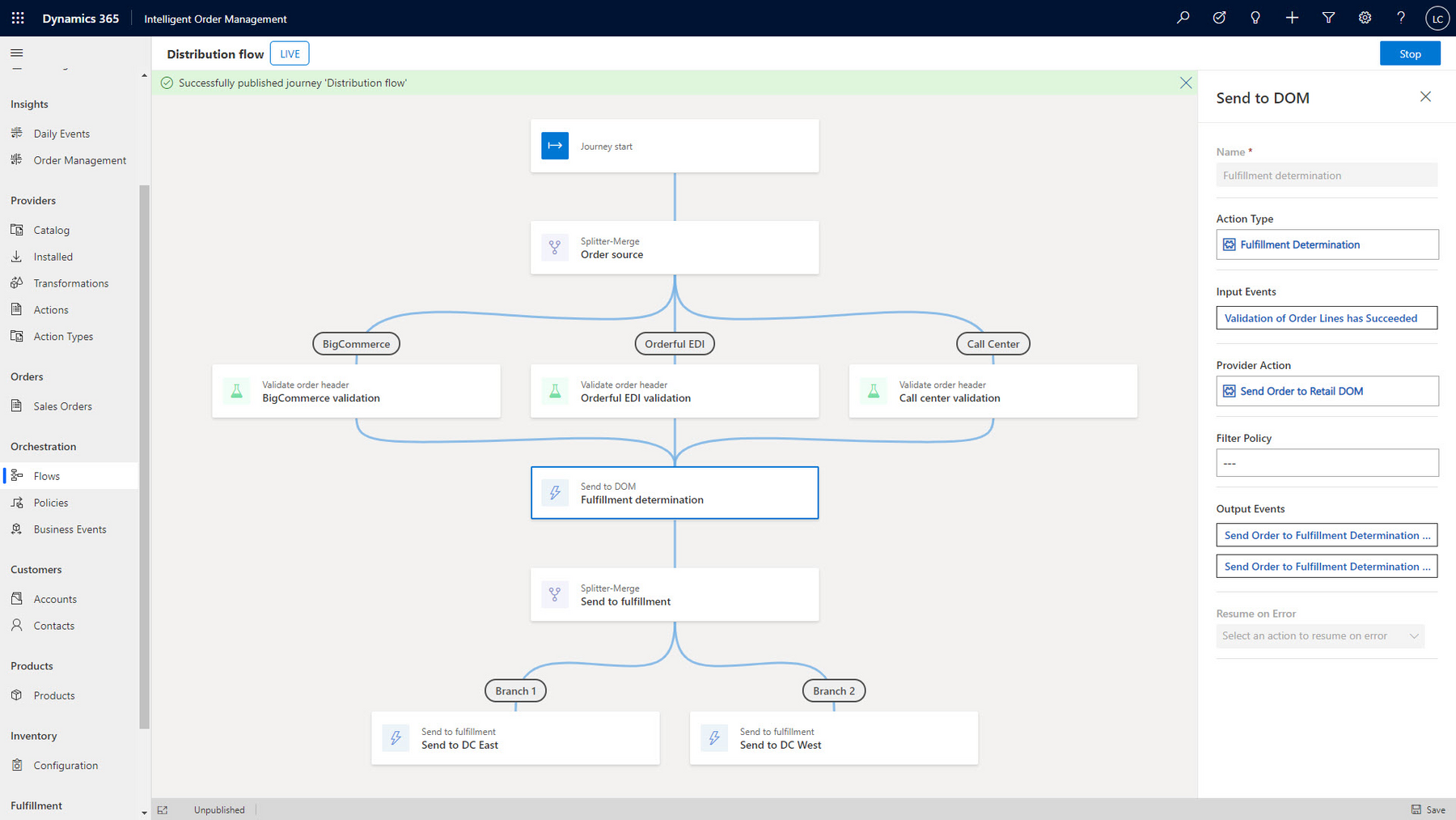 Gestión inteligente de pedidos de Microsoft Dynamics 365. Convierta el cumplimiento de pedidos en una ventaja competitiva. Satisfaga sus crecientes necesidades de comercio digital y escale fácilmente mientras admite los últimos métodos de cumplimiento. Adáptese rápidamente y entregue con eficacia. Mantenga su promesa de pedido. Automatice y agilice el cumplimiento con IA e inventario en tiempo real, supere proactivamente las interrupciones al reconfigurar los flujos de pedidos y escale rápidamente con conectores prediseñados. Utilice la orquestación de cumplimiento basada en reglas con inventario en tiempo real e IA para optimizar los flujos de pedidos con un potente manejo de excepciones. Obtenga información en tiempo real sobre cada pedido, desde la recepción hasta la entrega, utilizando paneles personalizables integrados. Modele y automatice fácilmente las respuestas a las restricciones de cumplimiento mediante el diseñador de políticas integrado de arrastrar y soltar para configurar los flujos de pedidos. Escale la gestión de pedidos utilizando conectores preconstruidos para la planificación de recursos empresariales (ERP), la toma de pedidos, el cumplimiento y los socios de entrega. Aumente la satisfacción del cliente proporcionando mayor flexibilidad, mayor transparencia y entregas a tiempo. Orquestación de cumplimiento eficiente: administre de manera centralizada los pedidos desde la captura hasta el cumplimiento utilizando datos de inventario omnicanal en tiempo real, inteligencia artificial y aprendizaje automático.