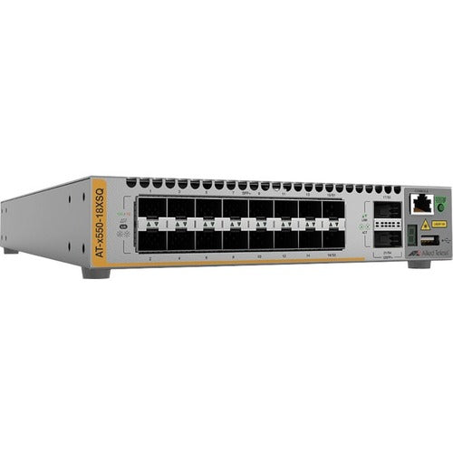Allied Telesis x550 x550-18XSQ Comutador de camada 3 - Ethernet de 10 Gigabit - 10GBase-X - Modular - 111 W Power Consumption - Fibra ótica - Montável sobre rack. Stackable 10 Gigabit Intelligent Switches. The Allied Telesis x550 Series of stackable 10 Gigabit Layer 3 switches have capacity and resiliency coupled with easy management, meeting the needs of even the most demanding network core and distribution applications. Overview: Allied Telesis x550 switches are high performing and feature-rich, making them the ideal choice for today's networks. Three models provide 16 x 1G/10G copper, 16 x 1G/10G SFP+ slots, or 8 x 1G/2.5G/5G/10G copper and 8 x 1G/10G SFP+ slots, all with two 40G uplinks. With the power of Allied Telesis Virtual Chassis Stacking (VCStack™), the x550 Series is ideal for the network core, and demanding distribution applications. Network automation: Vista ManagerTM EX bundled with Allied Telesis Autonomous Management FrameworkTM (AMF) meets the increasing management requirements of modern networks. While AMF allows an entire network to be securely and easily managed as a single virtual device, Vista Manager EX provides an intuitive and powerful graphical tool for monitoring and managing AMF wired and Autonomous Wave Control (AWC) wireless devices. Device and network management: The Device GUI on the x550 Series enables graphical monitoring of key switch features to support easy management. Integrated into the Device GUI, Vista ManagerTM mini supports visibility and management of AMF wired and AWC wireless network devices, making it ideal as a one-stop solution for small to medium-sized networks. AWC is an intelligent, easy to use Wireless LAN controller that automatically maintains optimal wireless coverage. Vista Manager mini includes AWC floor and heat maps showing wireless coverage. It also supports AWC Channel Blanket hybrid operation, providing maximum performance and seamless roaming, as well as AWC Smart Connect for simplified deployment, and a resilient Wi-Fi network solution using wireless uplink connectivity. Resiliency: Converging network services means increasing demand for highly available networks with minimal downtime. VCStack, in conjunction with link aggregation, provides a network with no single point of failure, and provides access application resiliency. Ethernet Protection Switched Ring (EPSRing™), and the standards-based G.8032 Ethernet Ring Protection, ensure distributed networks have high-speed access to online resources and applications. High-speed wireless: The spread of high-speed wireless (802.11ac or "Wave2") is problematic for network infrastructure. Unless the infrastructure is upgraded to cope with increased speeds, it creates a bottleneck which negatively impacts the effectiveness of the wireless network. But increasing speeds from 1 Gigabit has traditionally meant moving to 10 Gigabit. This requires new cabling, which is expensivnd timeto install.