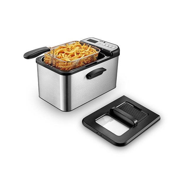 Freidora Digital 3000W con temporizador - Capacidad 4.2L - Paredes de acero inoxidable - Cuba esmaltada extraíble - Filtro antiolor de carbón - Termostato regulable (110º-190º) - Protección contra sobrecalentamiento - Ventana de control - Ventana de control - Motor integrado - Novedad: Separador de cocina - 5 Programas pregrabados