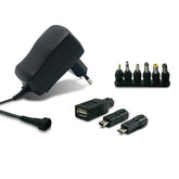 9 conectores: uno USB, un micro USB y un mini USB Voltaje de salida ajustable Polaridad reversible (excepto USB). Entrada: 100-240V ~ 50/60 Hz Salida: 3 / 4.5 / 5/6 / 7.5 / 9/12V Corriente máxima de salida: 600 mA