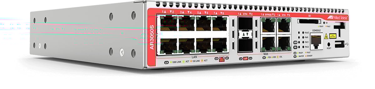 Allied Telesis AT-AR3050S-30. Saída da firewall: 750 Mbit/s, VPN throughput: 400 Mbit/s, Throughtput IPS/IDS: 220 Mbit/s. Frequência do processador: 800 MHz, Nível de ruído: 28,4 dB. Protocolos de encaminhamento: BGP4,OSPF,RIP-1,RIP-2. Tecnologia de conetividade: Com fios, Porta WAN: Ethernet (RJ-45). Capacidade de memória interna: 1024 MB. The AR3050S UTM Firewall consolidates threat protection, application and web control capabilities into a single device - ensuring the security of business communications. Together with advanced routing and switching, the AR3050S integrated security platform is the ideal choice for Internet gateway applications. The dual-core processor significantly increases throughput and enables simultaneous packet inspection. It is optimized for single-pass low-latency traffic inspection. Security engines and threat signature databases from the industry’s leading vendors, with regular updates, provide up-to-the-minute protection against malware, viruses and other cyber-attacks. - High availability bypass ports allow device redundancy with a single WAN link, reducing ongoing ISP fees. If the Master firewall loses power, traffic is automatically forwarded to the backup device. - A USB interface supports 3G/4G connectivity, so data transfer can automatically switch to a mobile network when a primary WAN connection becomes unavailable. - An SD card slot allows easy backup of important files. - Autonomous Management Framework™ (AMF) compatibility automates device back-up for plug-and-play recovery.