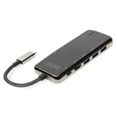 Digitus DA-70887. Interfaz de host: USB 3.2 Gen 1 (3.1 Gen 1) Tipo-C, Interfaces de concentrador: HDMI, RJ-45, USB 3.2 Gen 1 (3.1 Gen 1) Tipo-A, USB 3.2 Gen 1 (3.1 Gen 1) Tipo -C , Resolución máxima (HDMI): 3840 x 2160 píxeles. Velocidad de transferencia real: 5000 Mbit/s, Color del producto: Negro, Cromo, Material del cuerpo del producto: Aluminio, Plástico. Tipo de interfaz Ethernet: Gigabit Ethernet. Tipo de fuente de alimentación: USB. Sistema operativo Windows compatible: Windows 10, Windows 7, Windows 8, Sistema operativo Mac compatible: Mac OS X 10.12 Sierra, Mac OS X 10.13 High Sierra, Mac OS X 10.14 Mojave, Mac OS X 10.15 Catalina, Otro sistema operativo compatible: Android, iOS