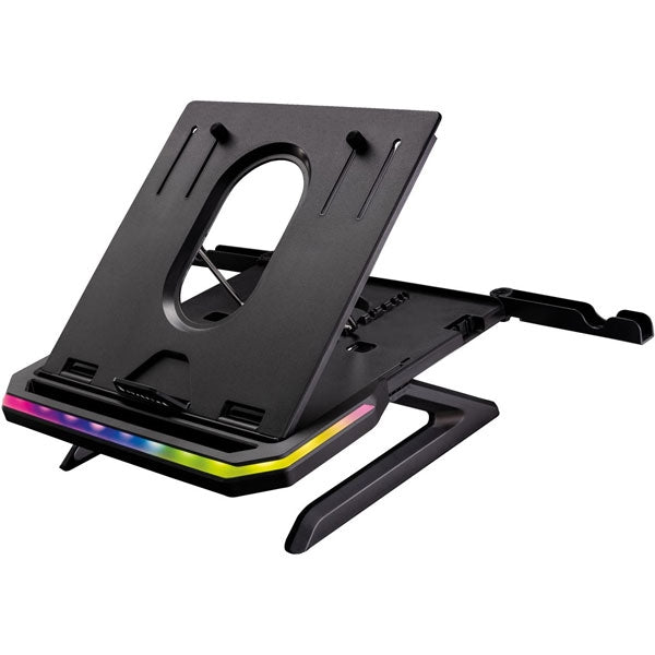 El SUREFIRE Portus X1 es un soporte para computadora portátil de 2 niveles con iluminación RGB. Con 9 ángulos de visión ajustables, 2 alturas ajustables, 2 soportes para teléfono, patas plegables e iluminación RGB, el soporte para computadora portátil para juegos Portus X1 garantiza que todo esté justo donde lo necesita para disfrutar de un excelente juego. Puede ajustar fácilmente la inclinación de su computadora portátil o tableta , lo que facilita soportar largas sesiones de juego. Las patas plegables le permiten elevar la plataforma a dos alturas diferentes para obtener el ángulo de visión perfecto y crear almacenamiento debajo para su teclado y mouse. Nunca vuelva a sentarse frente a su computadora portátil con la espalda torcida, el cuello rígido, dolor de espalda o de hombro y ojos cansados: solo juegue gracias a la ergonomía. Conecte el Portus X1 a un puerto USB y podrá elegir entre 6 modos de iluminación LED. diferente - más que suficiente para la atmósfera de juego perfecta. Los orificios de ventilación en el soporte de la computadora portátil facilitan el flujo de aire, lo que ayuda a reducir la temperatura de funcionamiento. Esto protege la computadora portátil contra el sobrecalentamiento.Construido con ABS y metal de alta calidad, el Portus X1 puede soportar computadoras portátiles que pesen hasta 10 kg y tamaños de 10 a 17,3 pulgadas. Su computadora portátil, Mac o tableta se mantiene en su lugar gracias a un pie de apoyo superior y una almohadilla de goma antideslizante. Los dos soportes para teléfono móvil en la parte posterior del soporte para computadora portátil garantizan que también pueda usar su teléfono móvil de forma rápida y sencilla.