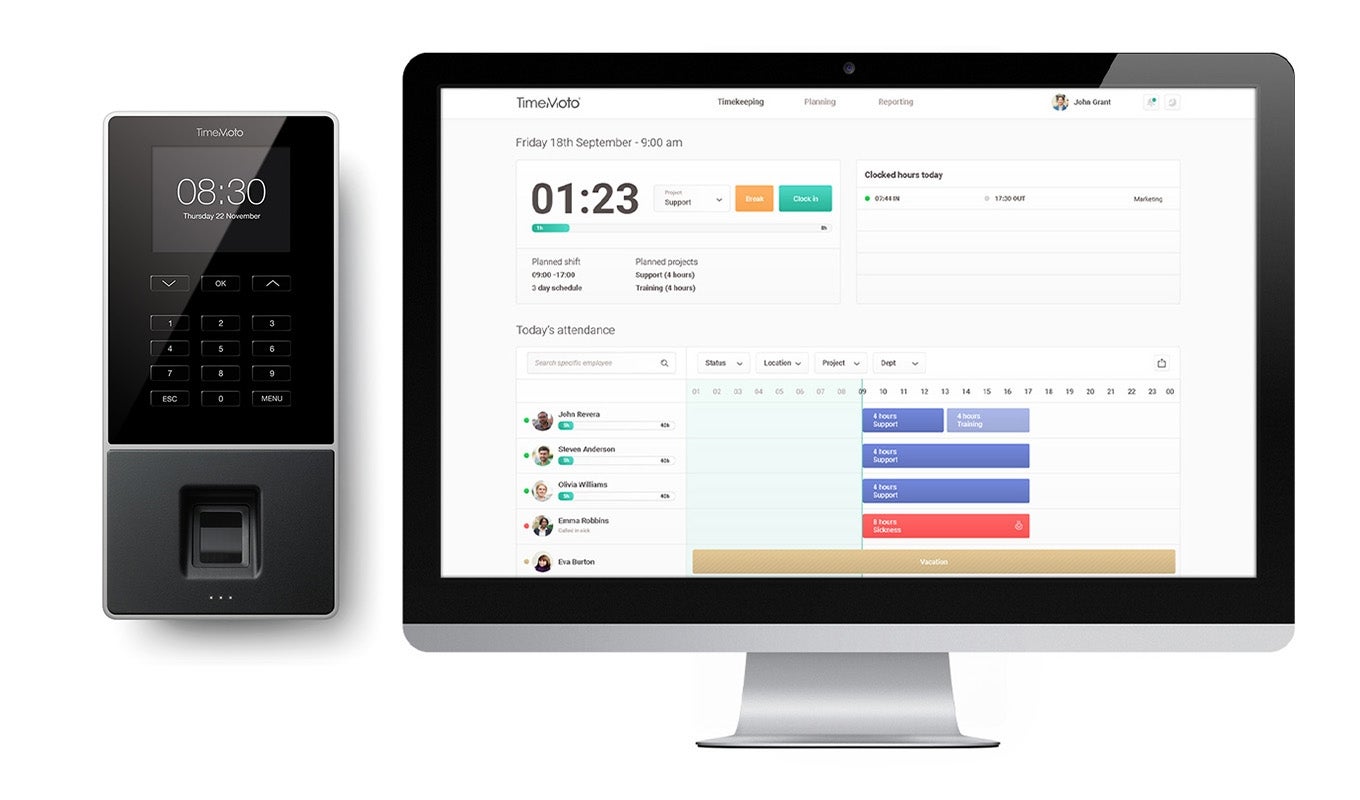 Los empleados pueden elegir cómo registrarse: tarjeta RFID, escaneo de huellas dactilares o identificación con PIN. TimeMoto TM-626 se comunica a la perfección con TimeMoto Cloud. Siempre tienes información precisa e instantánea sobre las horas y la asistencia de los empleados.