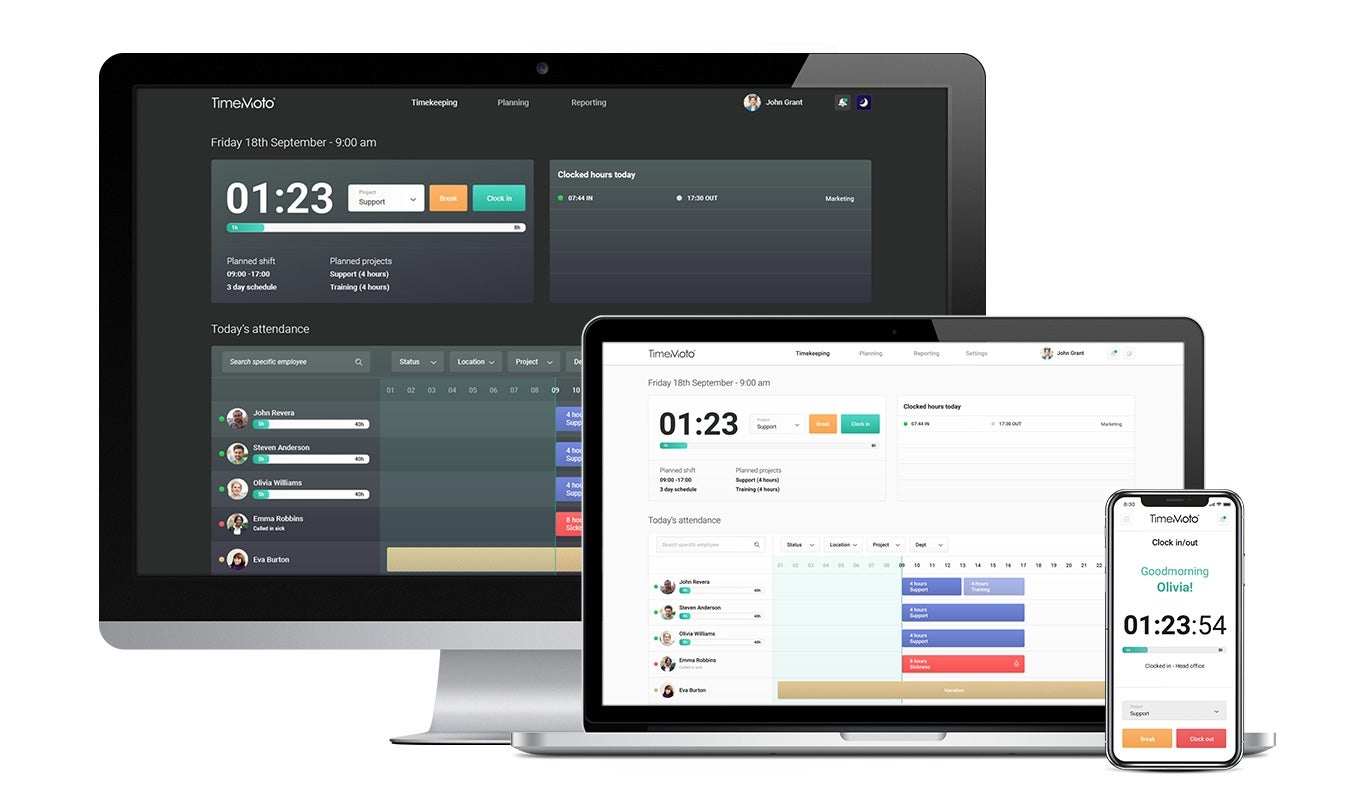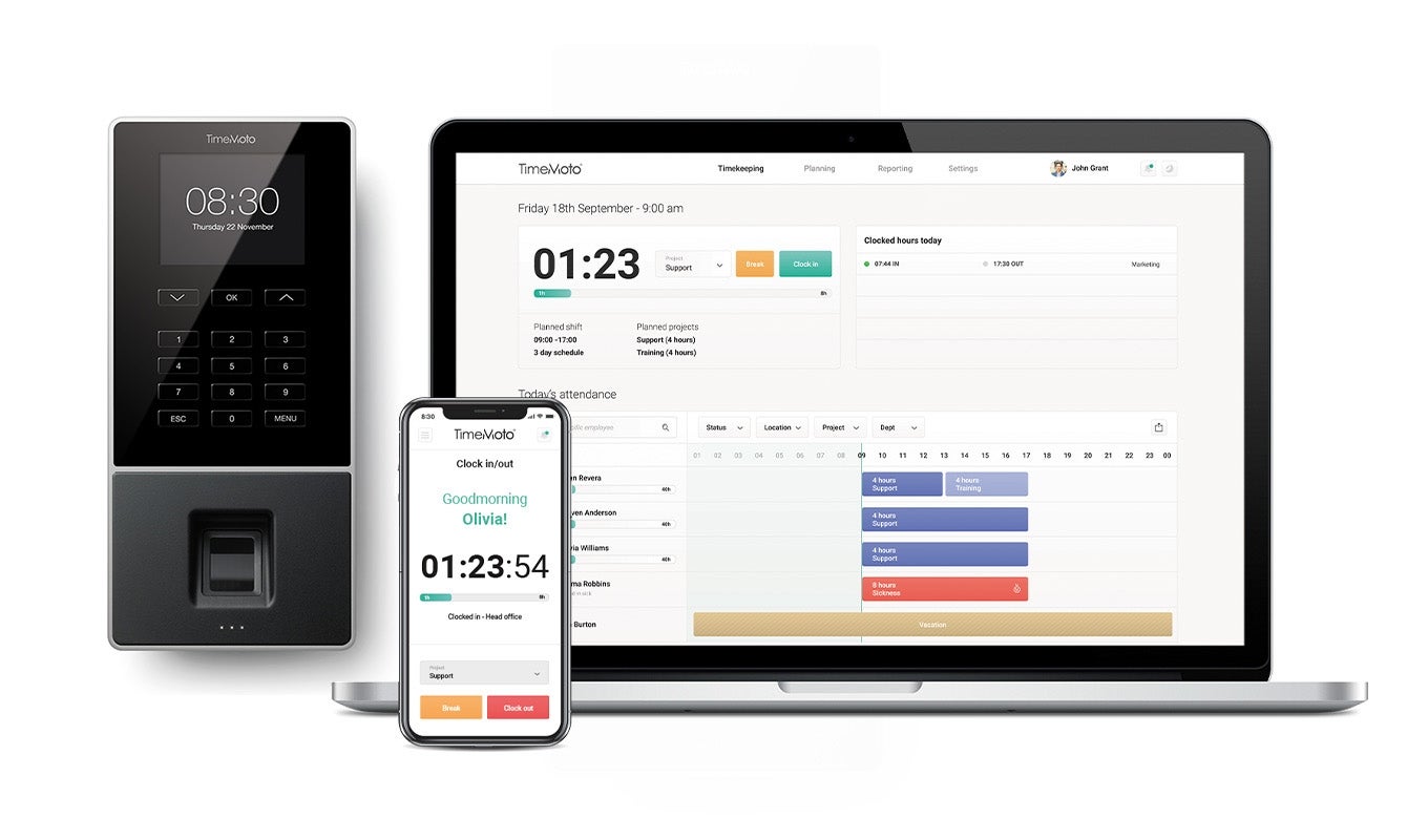 Combine su dispositivo TimeMoto con TimeMoto Cloud para obtener la máxima flexibilidad. Nuestra solución inteligente en la nube le brinda una vista y control completos de su gestión del tiempo en una sola aplicación simple. Con solo unos pocos clics, puede monitorear todos los datos de registro de tiempo desde su dispositivo TimeMoto, editar e informar direcciones en tiempo real, cuando y donde quiera que esté. Cree horarios detallados para su equipo y administre sus horas extras, ausencias, solicitudes de vacaciones y mucho más.