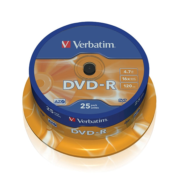 Verbatim DVD-R, Capacidad: 4,7 GB, Velocidad: 16x, Estilo del paquete: Paquete de 25 Superficie del disco del eje: Plata mate