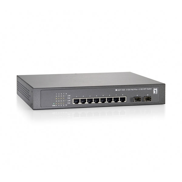- 8 PoE-Plus Gigabit Ethernet ports and 2 Gigabit SFP slots- 1000Mbps-Full-duplex, 10/100Mbps-Full/Half-duplex, Auto-Negotiation, Auto-MDI/MDIX- IEEE 802.3af/at PoE compliant to simplify deployment and installation- 9K jumbo frames to increase data transfer rates- Supports 8K MAC address auto-learning and auto-aging- Auto-detection and protection of non-standard PoE devices- IEEE 802.3x Flow Control protects against lost packets for reliable data transmission- Minimize carbon footprint with advanced energy efficient technology (IEEE 802.3az)- 19-inch rackmount kit included- Total PoE power budget: 150W, up to 30W per port
