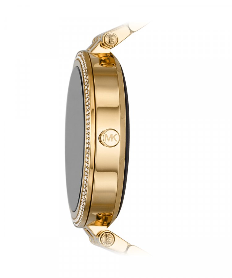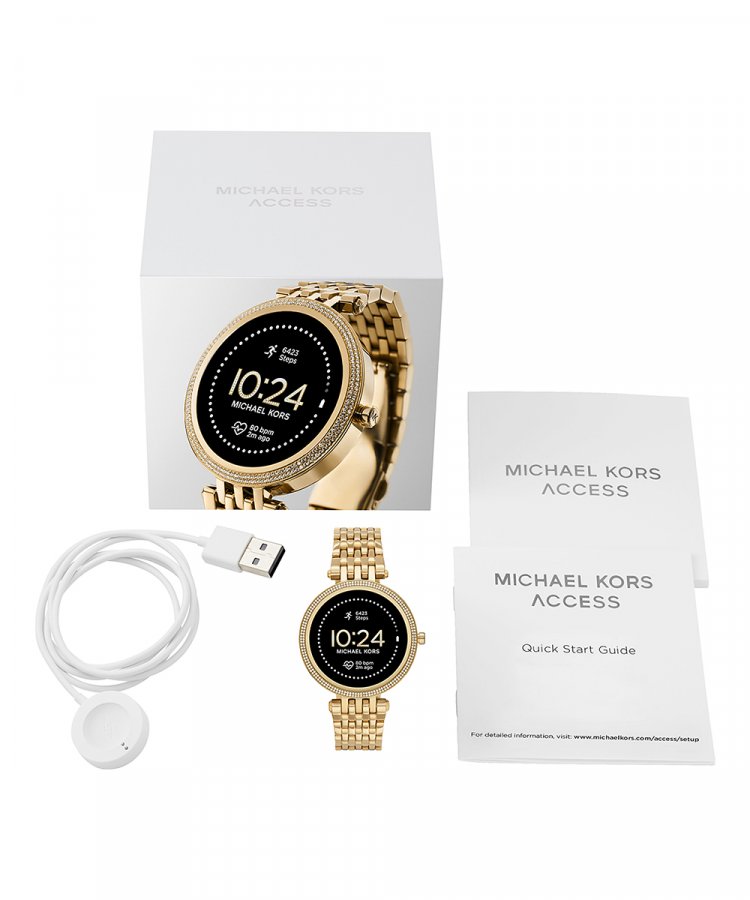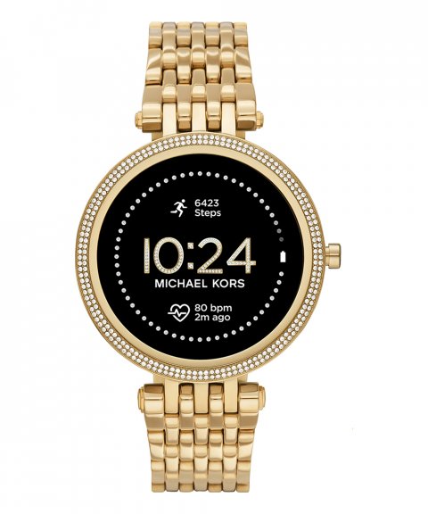 Michael Kors MKT5127. Tamanho do ecrã na diagonal: 3,02 cm (1.19"), Tecnologia de apresentação: AMOLED, Resolução: 390 x 390 pixels. Wi-Fi. Material de banda: Aço inoxidável, Cor da pulseira: Dourado, Dimensões da pulseira: Tamanho único. Michael Kors' 43mm Gen 5E Darci Smartwatch pairs the latest Wear OS by Google technology with glamorous design, featuring a pavé, gold-tone topring and matching seven-link stainless steel bracelet. Smartwatches powered with Wear OS by Google are compatible with iPhone® and Android™ phones. Wear OS by Google and other related marks are trademarks of Google LLC. Supported features may vary across platforms and countries.