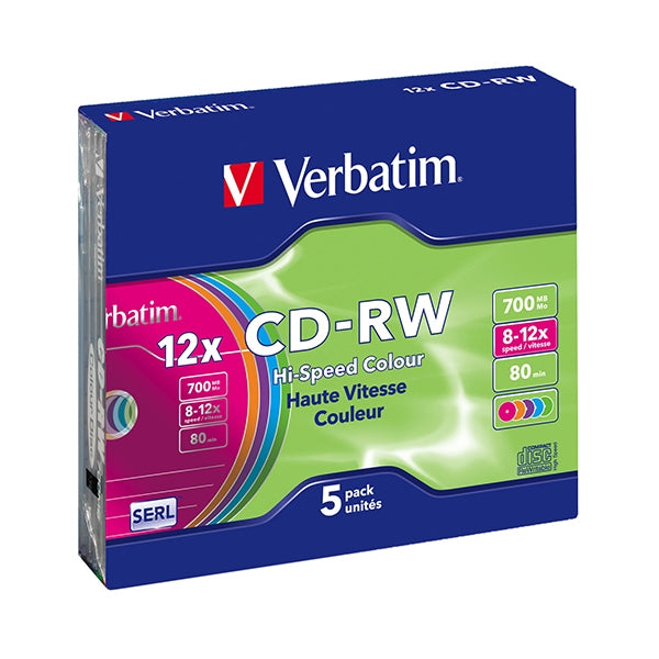 VERBATIM CD-RW 8X-12X 700MB 80MIN CAIXA SLIM COLOUR PACK 5