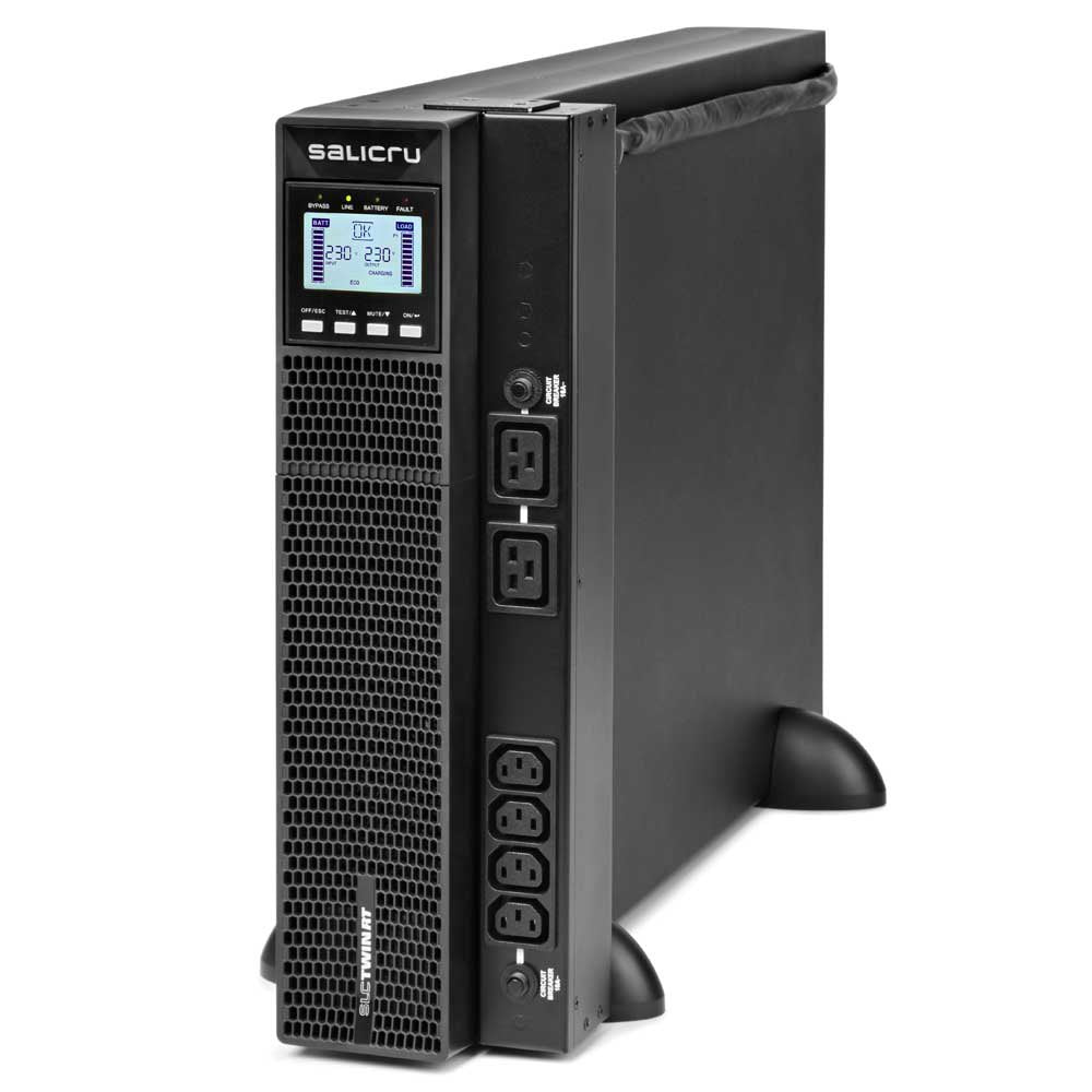 Salicru SLC-4000-TWIN RT2 B1. Topologia UPS: Dupla conversão (Online), Capacidade de energia de saída: 4 kVA, Potência de saída: 4000 W. Tipos de tomada AC: Terminal, Tipo de interface em série: RS-232. Tecnologia da bateria: Chumbo-Cálcio (Pb-Ca), Tempo de carga: 9 h. Forma: Montagem em Rack/Torre, Cor do produto: Preto, Capacidade do rack: 4U. Largura: 438 mm, Profundidade: 688 mm, Altura: 88 mm. Os modelos da série SLC TWIN RT2 da Salicru são Sistemas de Alimentação Ininterrupta (UPS) com as máximas prestações de proteção elétrica para ambientes críticos de servidores. O formato duplo torre/rack permite a adaptabilidade física a qualquer localização que, em conjunto com a barra PDU incorporada, facilita ao máximo a ligação das cargas a proteger. Da mesma forma, o fator de potência de saída unitário (VA=W) aumenta a densidade de potência entregue e reduz o espaço necessário para a instalação do UPS. O ecrã LCD é orientável segundo o formato de montagem escolhido para um manuseamento mais fácil. Quanto às comunicações de série, dispõe de interfaces USB, RS-232 e relés, bem como de um slot inteligente para alojar, opcionalmente, uma placa SNMP, MODBUS ou contactos livres de potencial; também estão disponíveis pacotes de software para a monitorização e gestão, local ou virtual, dos equipamentos protegidos. Para as aplicações que precisem de um backup alargado, podem ser instalados módulos adicionais de baterias e/ou soluções com carregador adicional. E para aplicações que precisem de proteção redundante ou de mais potência, existe a opção de ligar três equipamentos em paralelo.