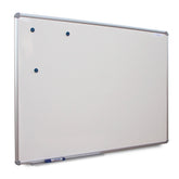 Quadro magnético c/ superfície de escrita em porcelana branca , vitrificada a 800º | Costas forradas a película de alumínio anti humidade | Moldura em perfil de alumínio com cantos ergonómicos em nylon de cor cinza | Porta marcadores c/ 50cm | Quadros adequados para uso intensivo, nomeadamente em escolas, centros de formação e fábricas