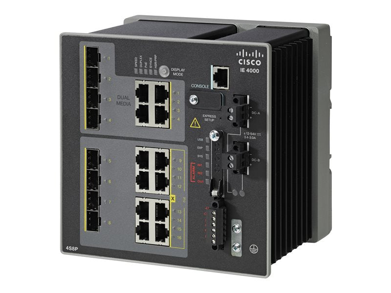Cisco Industrial Ethernet 4000 Series - Interruptor - Administrado - 8 x combo Gigabit SFP + 4 x 10/100/1000 (PoE+) - montável em trilho DIN - PoE+ - DC power - Compatível com TAA